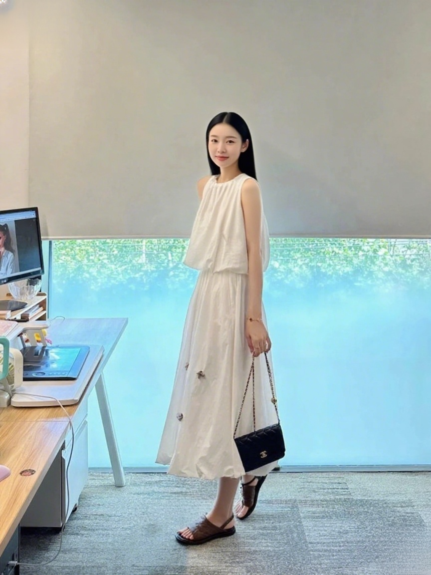 3つ目は、純白のノースリーブワンピースでライトビジネスシーンに最適!濃い茶色のフラットサンダルと合わせて、エレガントでありながら堅苦しくない~ レザーサンダルのすっきりとしたラインは、ワンピースの柔らかさを引き締めます。シャネル風のバッグと合わせれば、顧客訪問や軽めの会議でも、スタイル抜群👗 さらに、フラットデザインで通勤中も疲れにくく、エレガントな「ワーキングガール」のイメージを見事に演出!.png?w=864&h=1152)