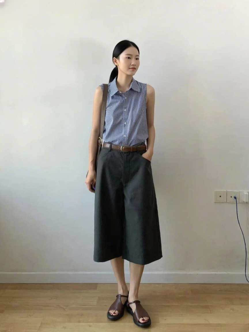 最初のコーディネートは、チェック柄ノースリーブシャツ+濃いグレーのワイドパンツという定番のオフィススタイル。シンプルな茶色のフラットレザーサンダルと合わせて、プロフェッショナルと楽さを完璧にバランス!レザー特有の繊細な質感は、ベルトと呼応して全体の洗練度をアップ。フラットデザインで疲れにくく、地下鉄通勤や顧客訪問も余裕です~ このベーシックなサンダルは、スーツパンツやストレートスカートにも簡単に合わせられます💼.png?w=864&h=1152)