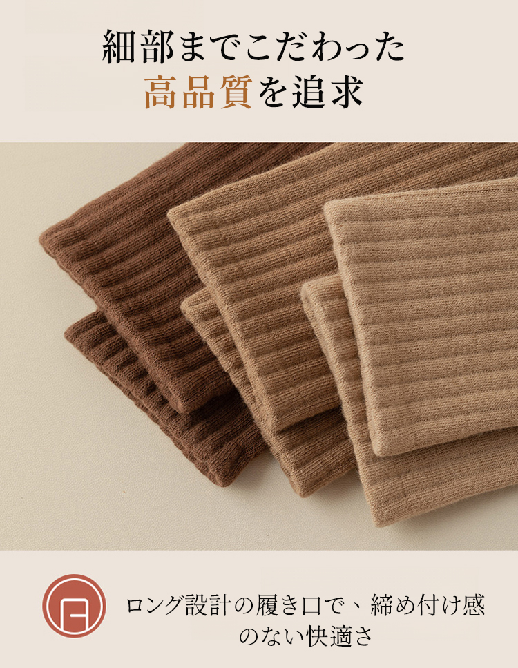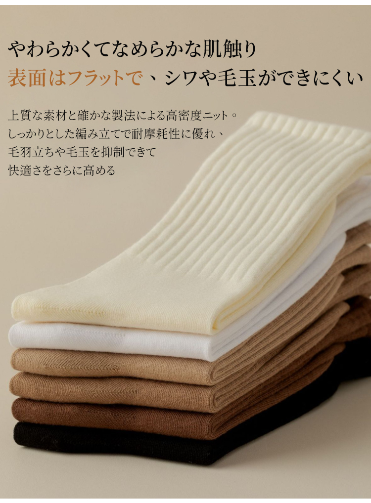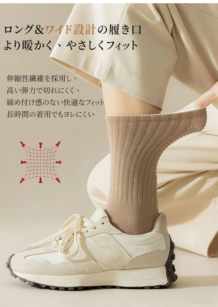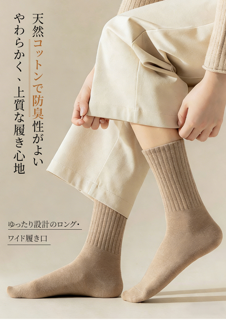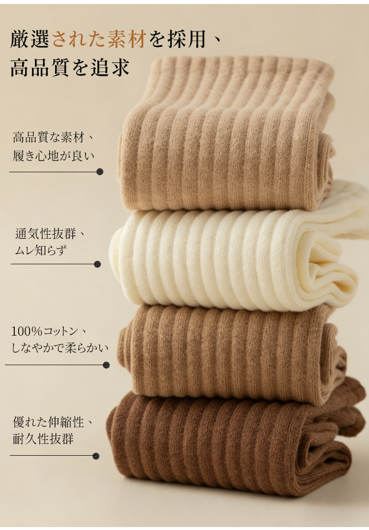 コットン100%の無骨ソックス 綿100%素材を使用したリブソックスの着用イメージ ナチュラルで上品な質感のベージュカラー 厳選された素材による高品質リブソックス 通気性抜群でしなやかな生地のクローズアップ ロング&ワイド設計の履き口を手で広げる様子 締め付け感のない高弾性リブの機能説明 高品質な綿100%素材の繊維拡大図 より柔らかく、よりしなやかな肌触りの証明 スニーカーに合わせたリブソックスのスタイリング 自在なファッションを楽しめる足元 スニーカーに合わせたリブソックスのスタイリング 自在なファッションを楽しめる足元 多彩なカラーバリエーションの4足セット ブラック、ブラウン、ベージュ、グレーのラインナップ シームレスソックス