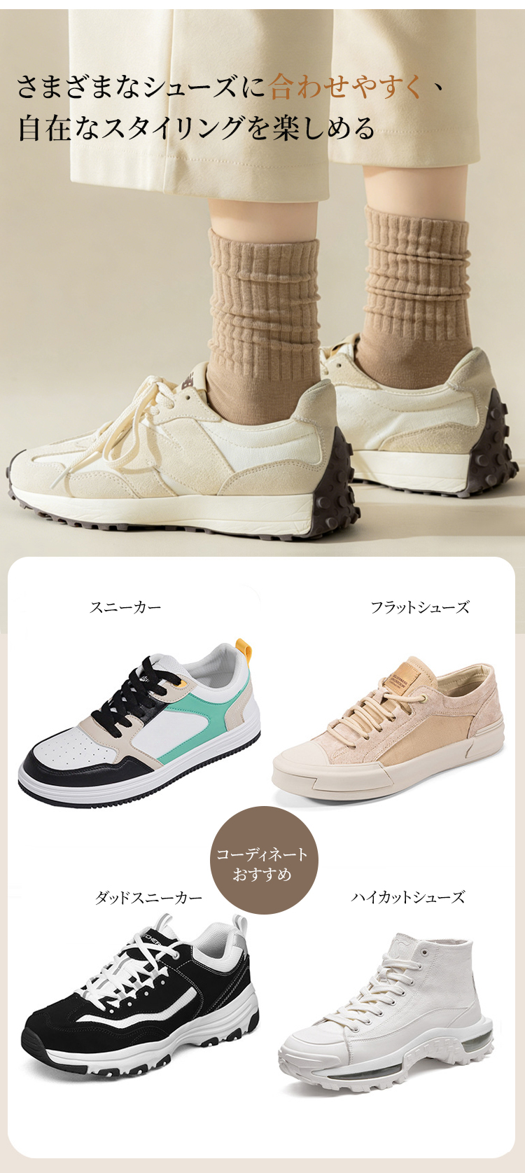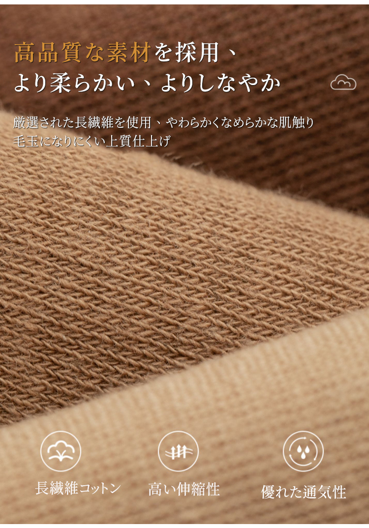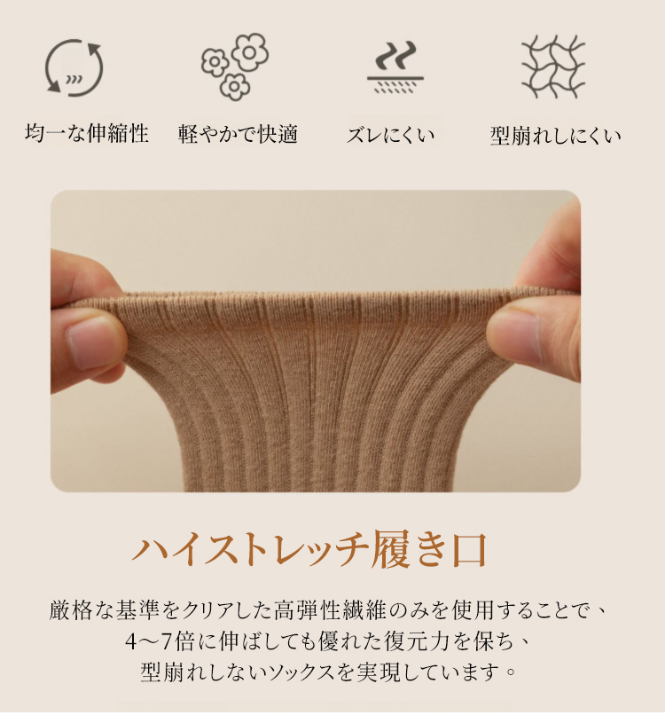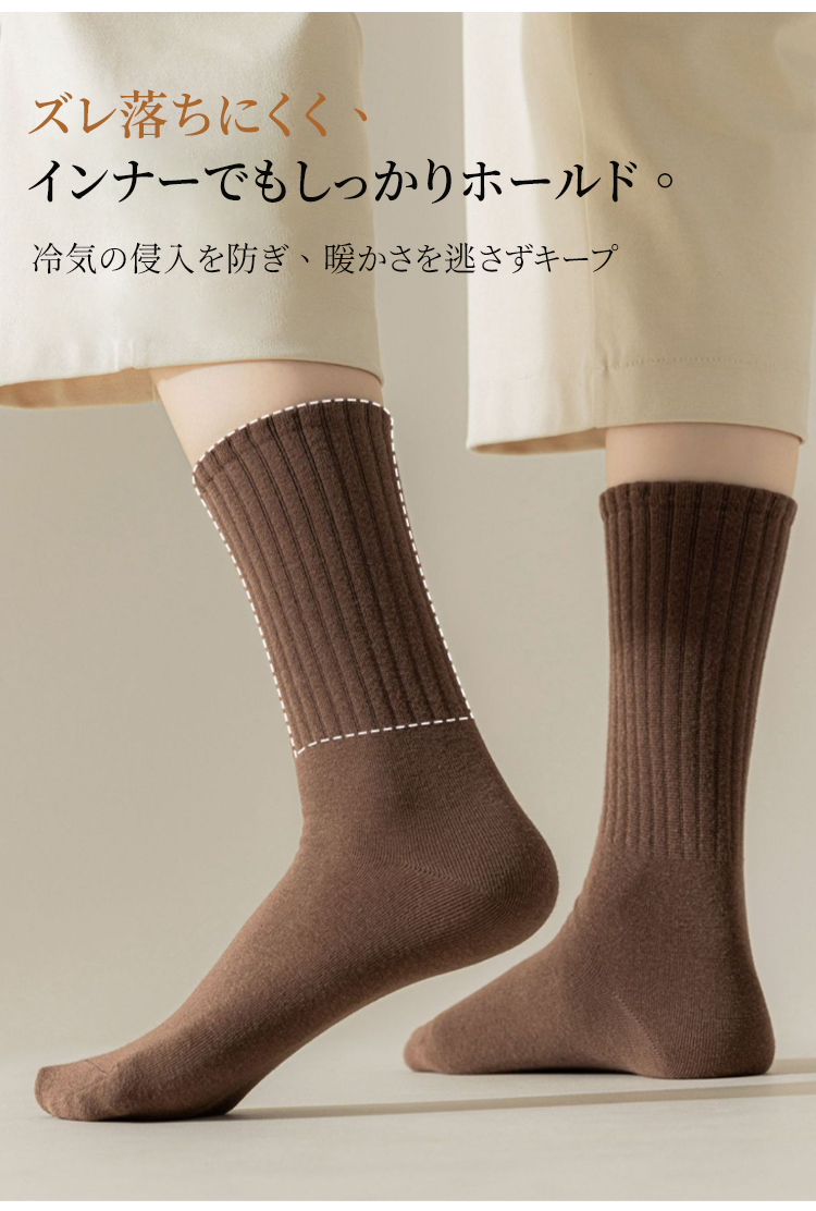 コットン100%の無骨ソックス 綿100%素材を使用したリブソックスの着用イメージ ナチュラルで上品な質感のベージュカラー 厳選された素材による高品質リブソックス 通気性抜群でしなやかな生地のクローズアップ ロング&ワイド設計の履き口を手で広げる様子 締め付け感のない高弾性リブの機能説明 高品質な綿100%素材の繊維拡大図 より柔らかく、よりしなやかな肌触りの証明 スニーカーに合わせたリブソックスのスタイリング 自在なファッションを楽しめる足元 スニーカーに合わせたリブソックスのスタイリング 自在なファッションを楽しめる足元 多彩なカラーバリエーションの4足セット ブラック、ブラウン、ベージュ、グレーのラインナップ シームレスソックス