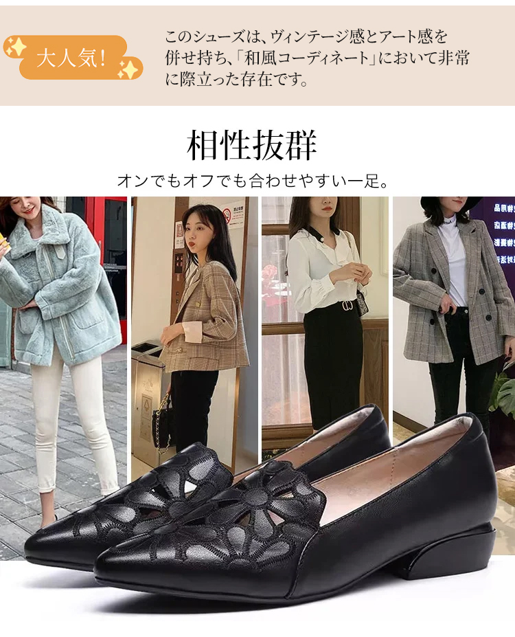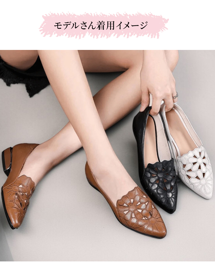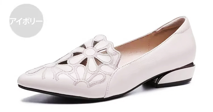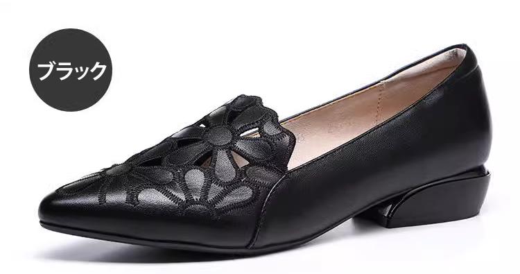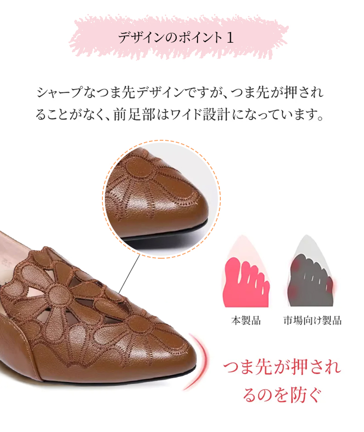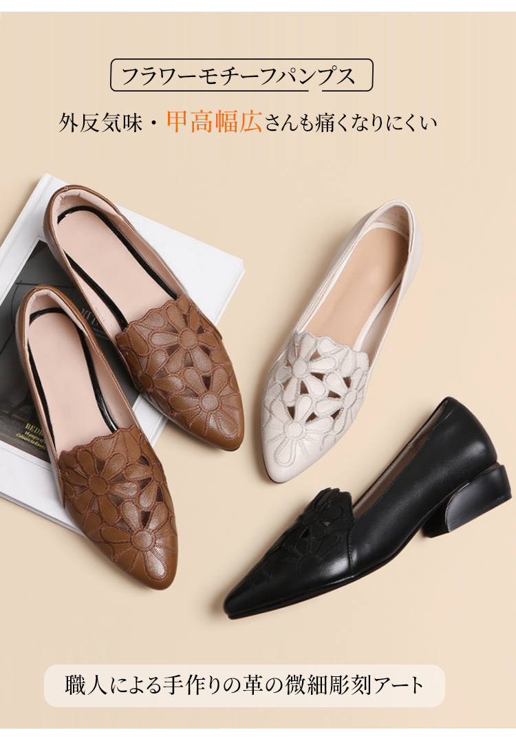 外反母趾対応 フラワーカット ポインテッドトゥ パンプス ローヒール 2.5cm 痛くない 幅広 甲高