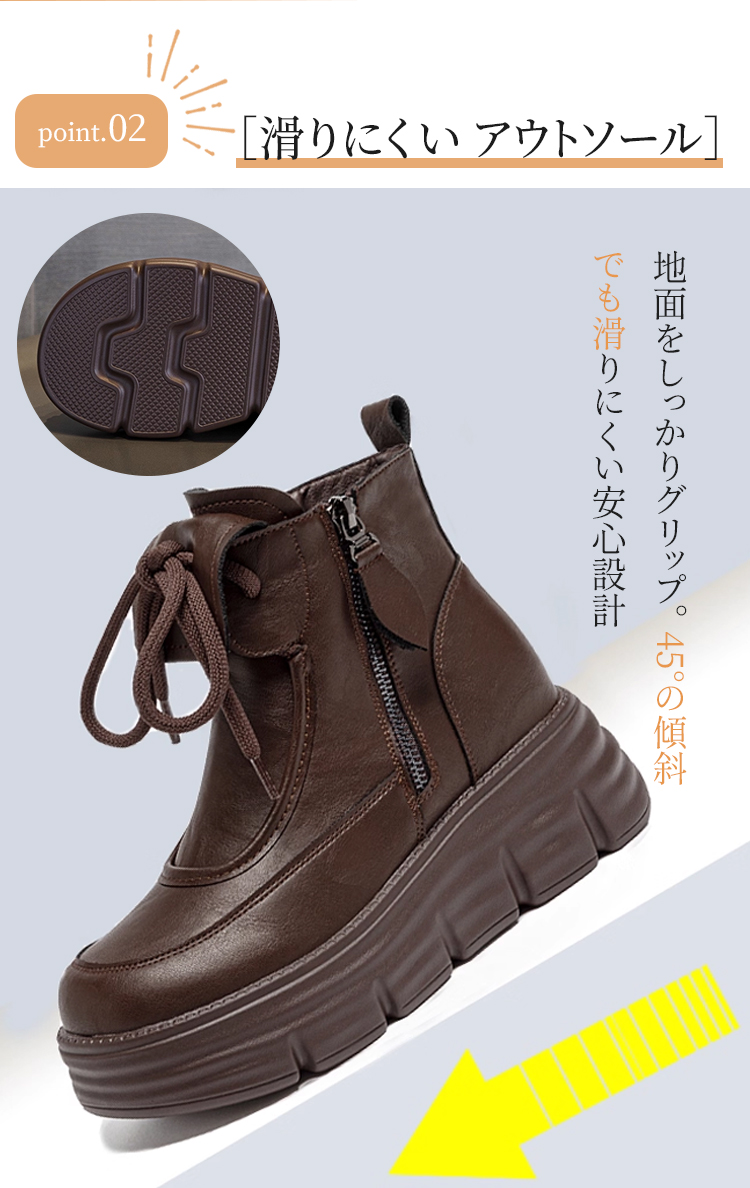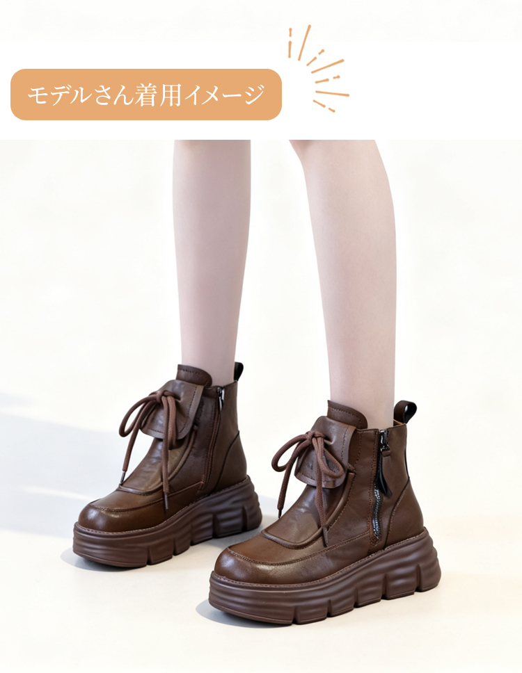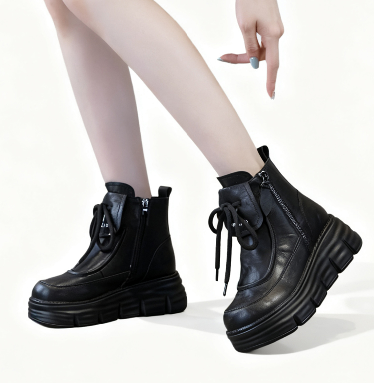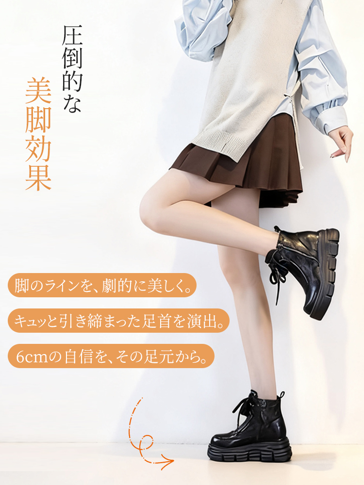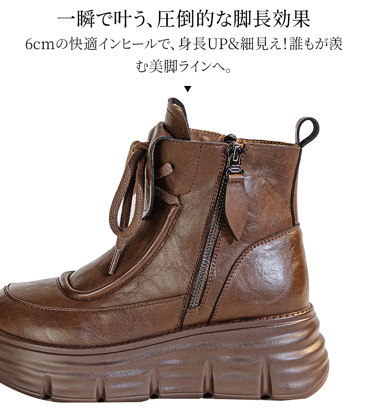 牛革シボ加工 厚底ショートブーツ 6cmヒール サイドジップ仕様 裏起毛