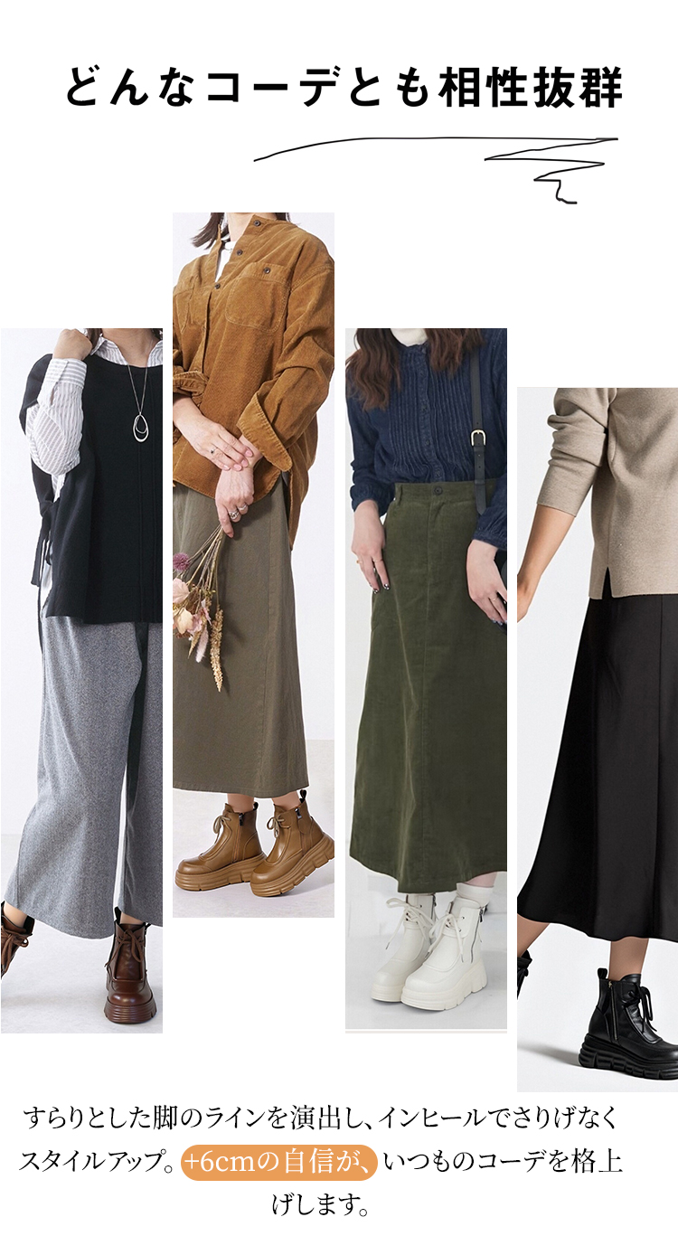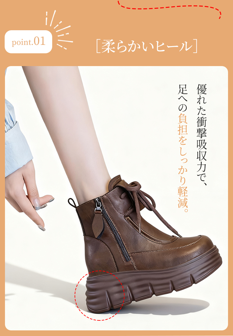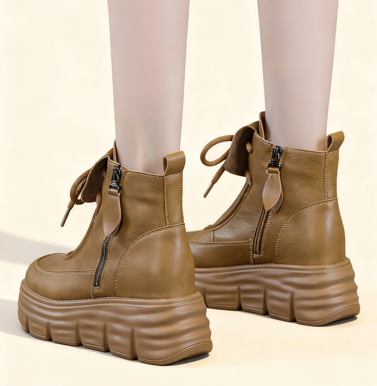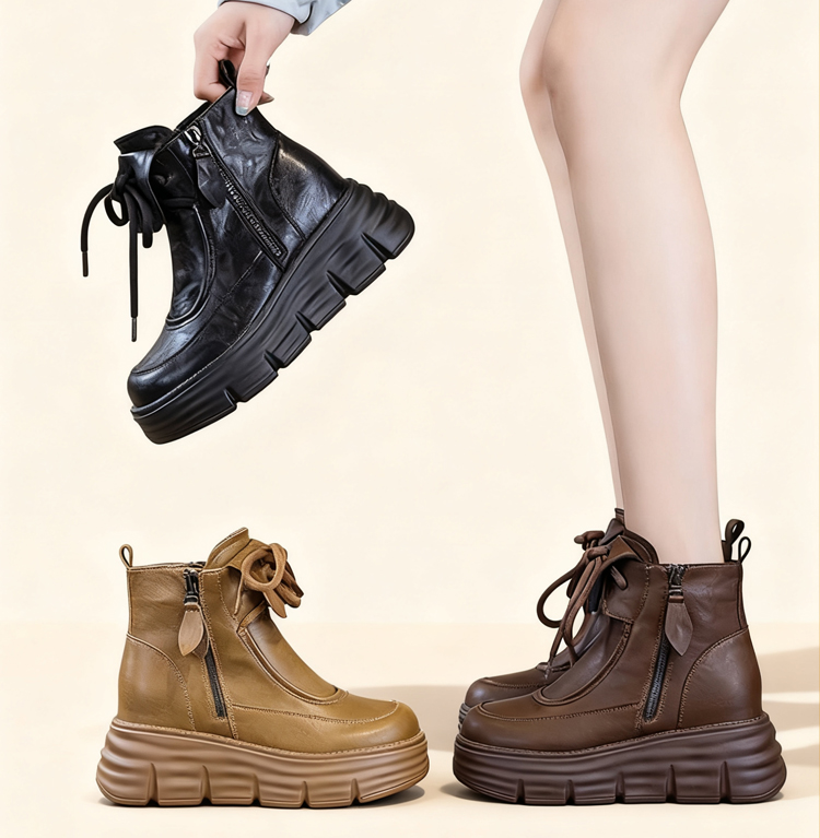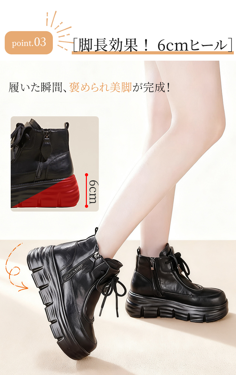 牛革シボ加工 厚底ショートブーツ 6cmヒール サイドジップ仕様 裏起毛