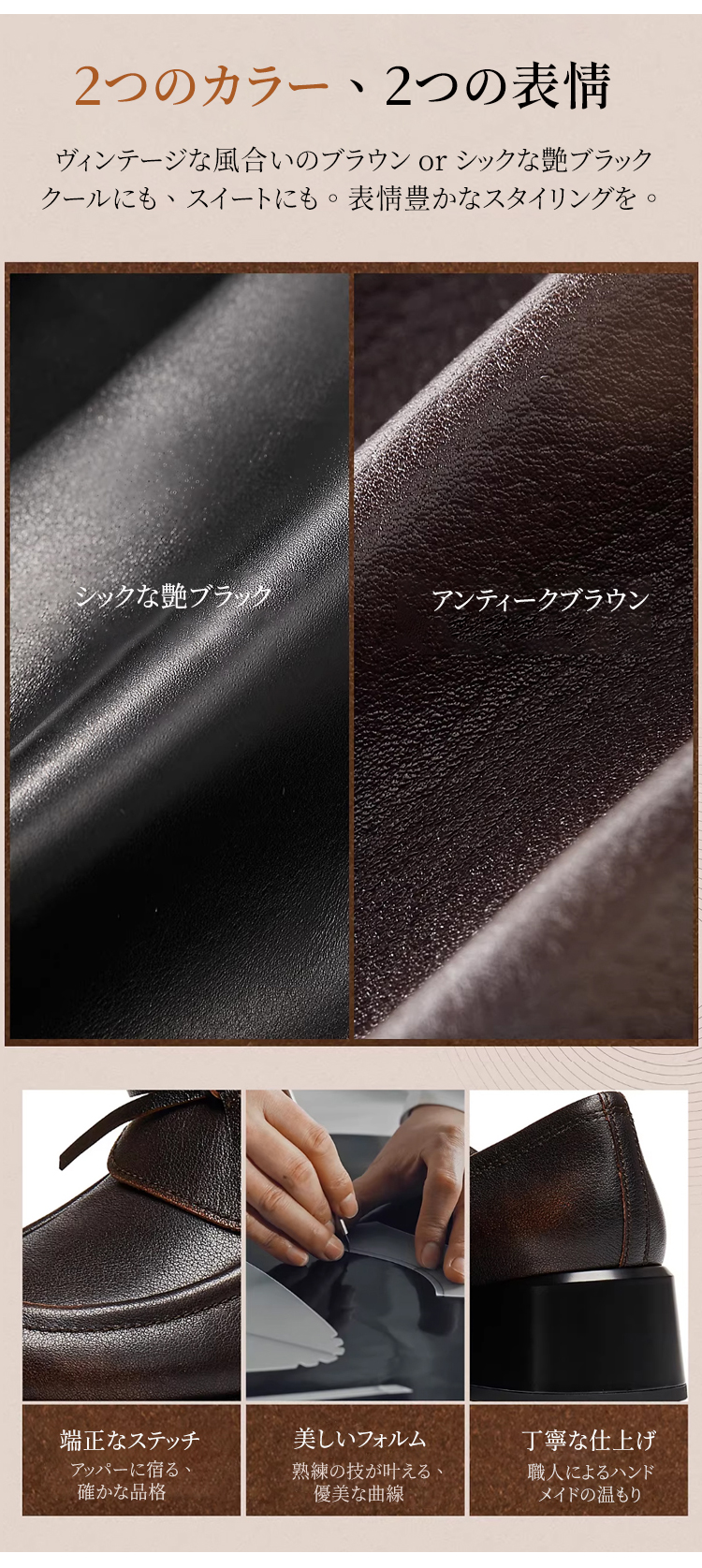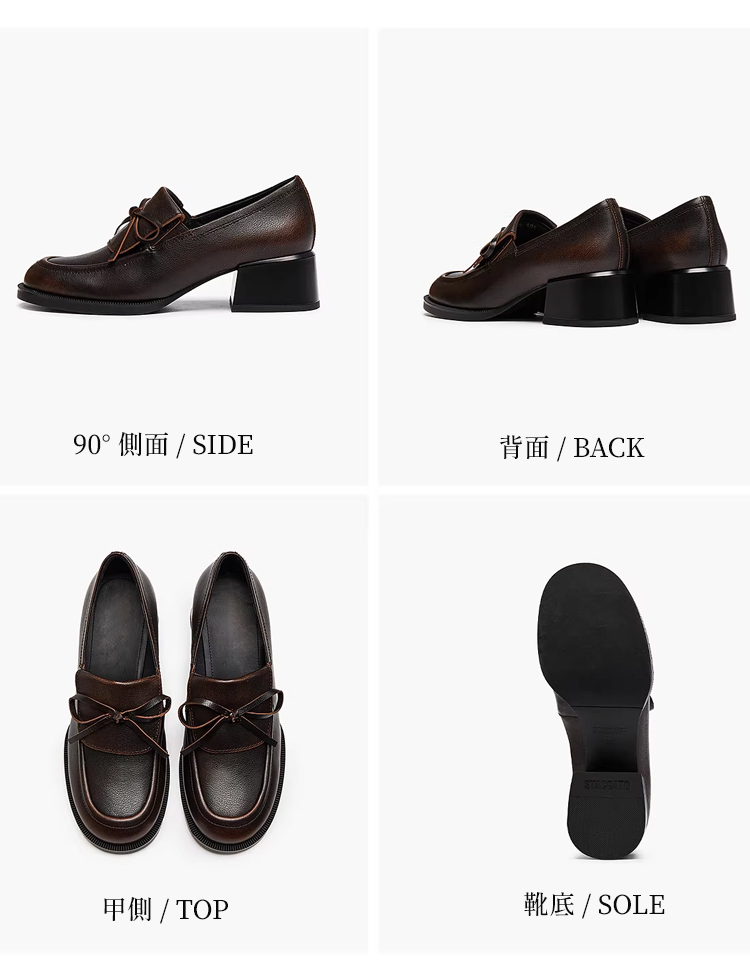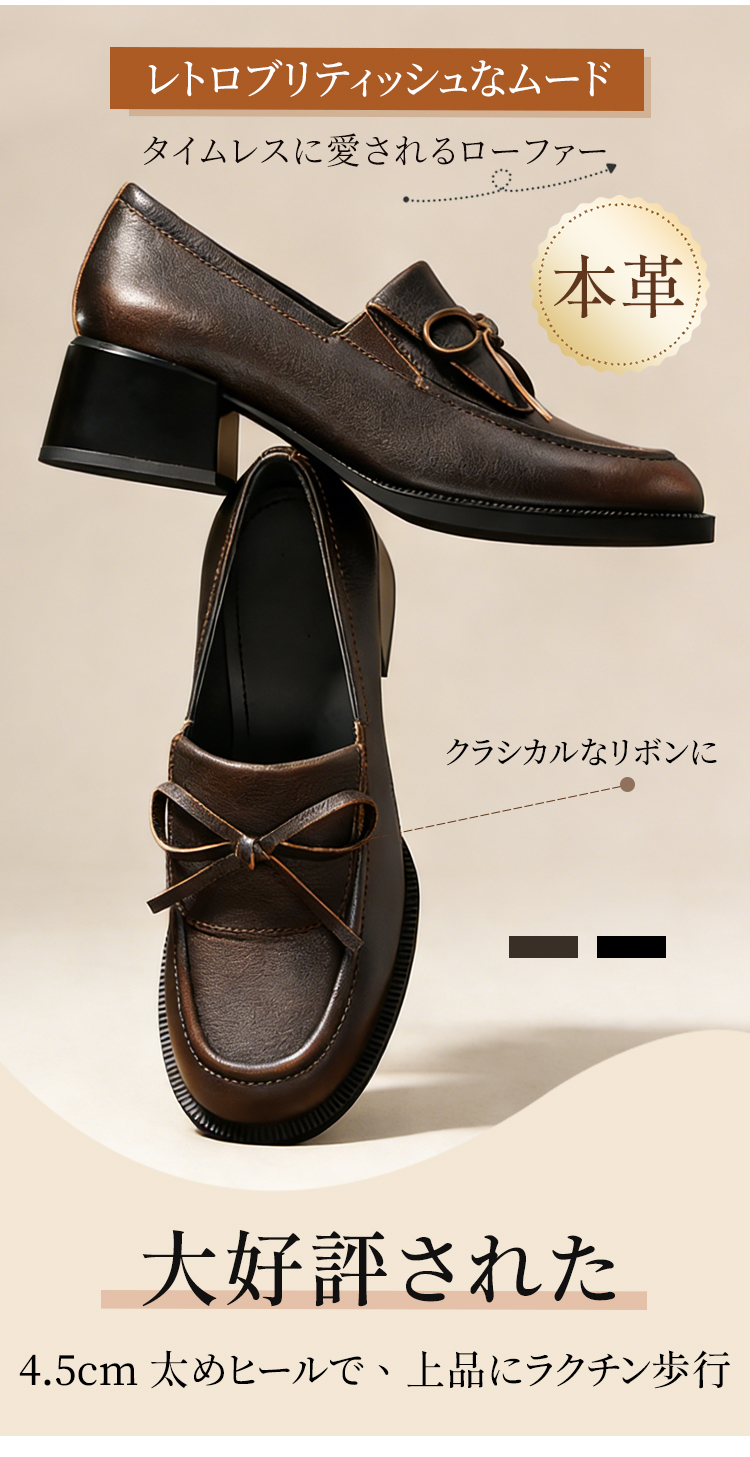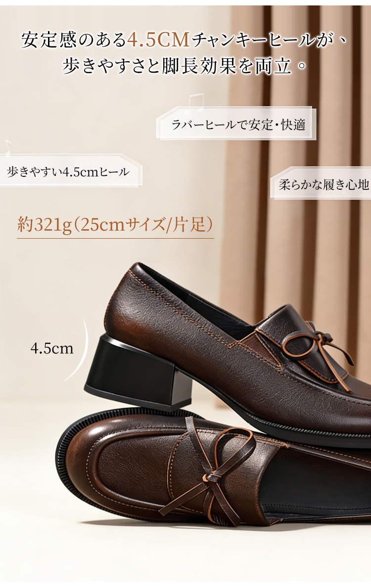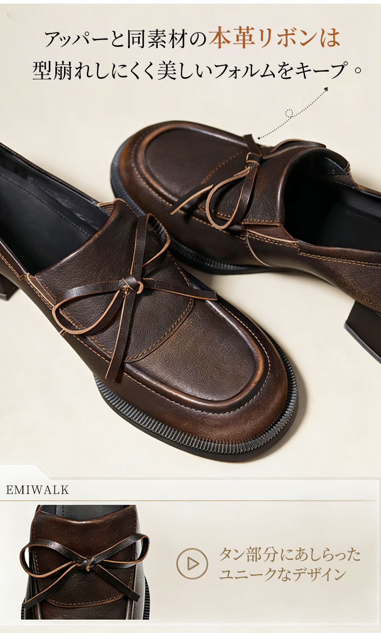 イギリス風ボウローファー|4.5cm太めヒールで、上品にラクチン歩行 Emiwalk 本革リボンローファー アンティークブラウンの足元着用イメージ 柔らかく足馴染みの良い上質な本革アッパー素材の質感 大人上品な印象を与える同素材の本革リボンデザイン詳細 歩きやすさと美脚効果を両立する4.5cmチャンキーヒールの側面 甲高・幅広・外反母趾の方でも快適に履けるブラックローファーの着用 シックなブラックとアンティークブラウンのカラー比較と職人の手仕事 イギリス風ボウローファー|4.5cm太めヒールで、上品にラクチン歩行