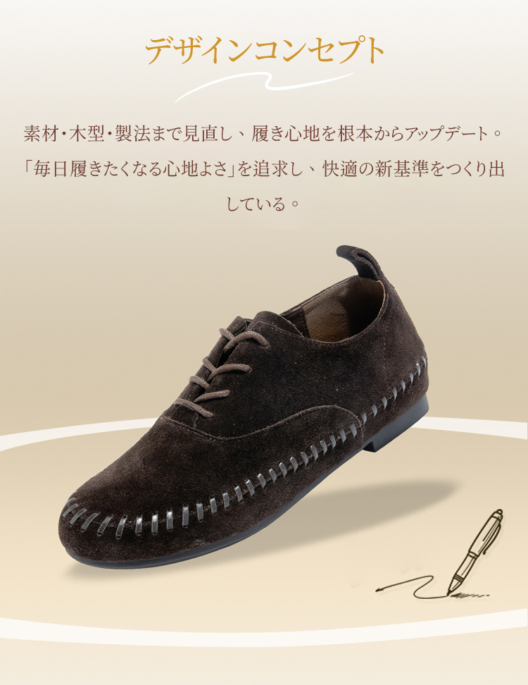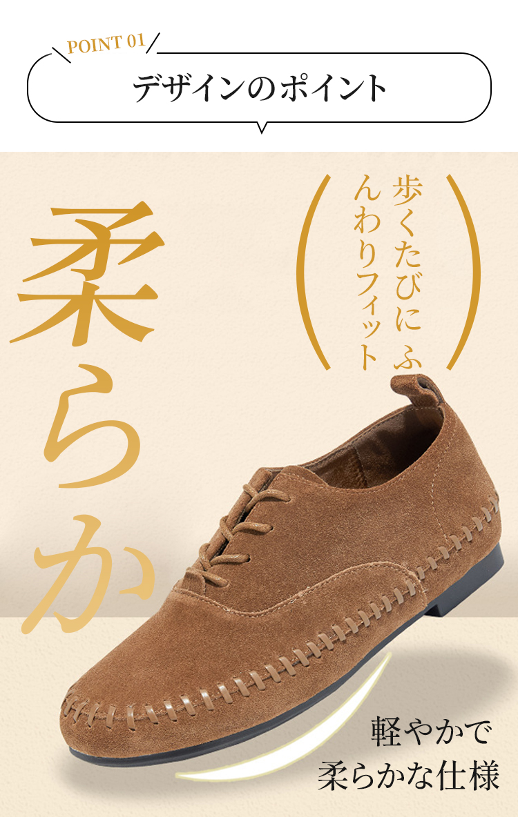 本革フラットシューズ レディース プレミアム牛革 180度屈曲 疲れにくい 幅広 ゆったり設計