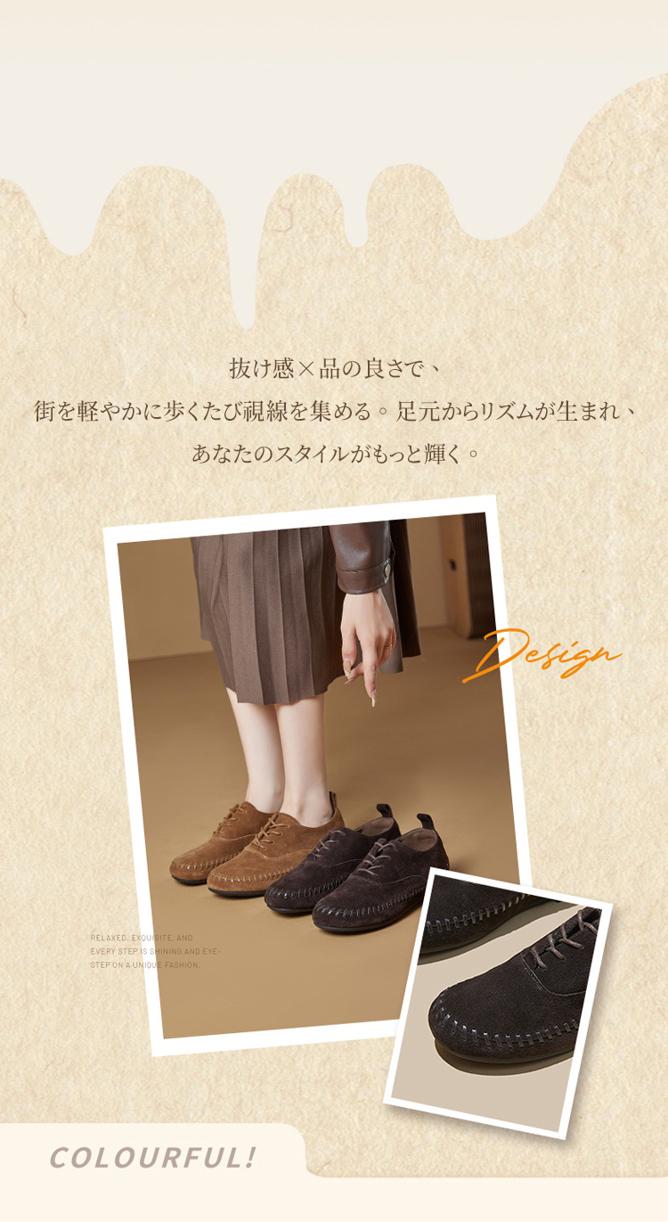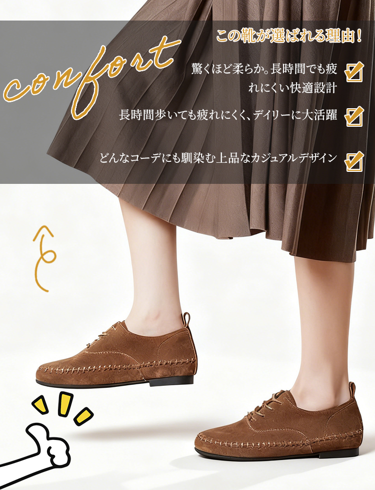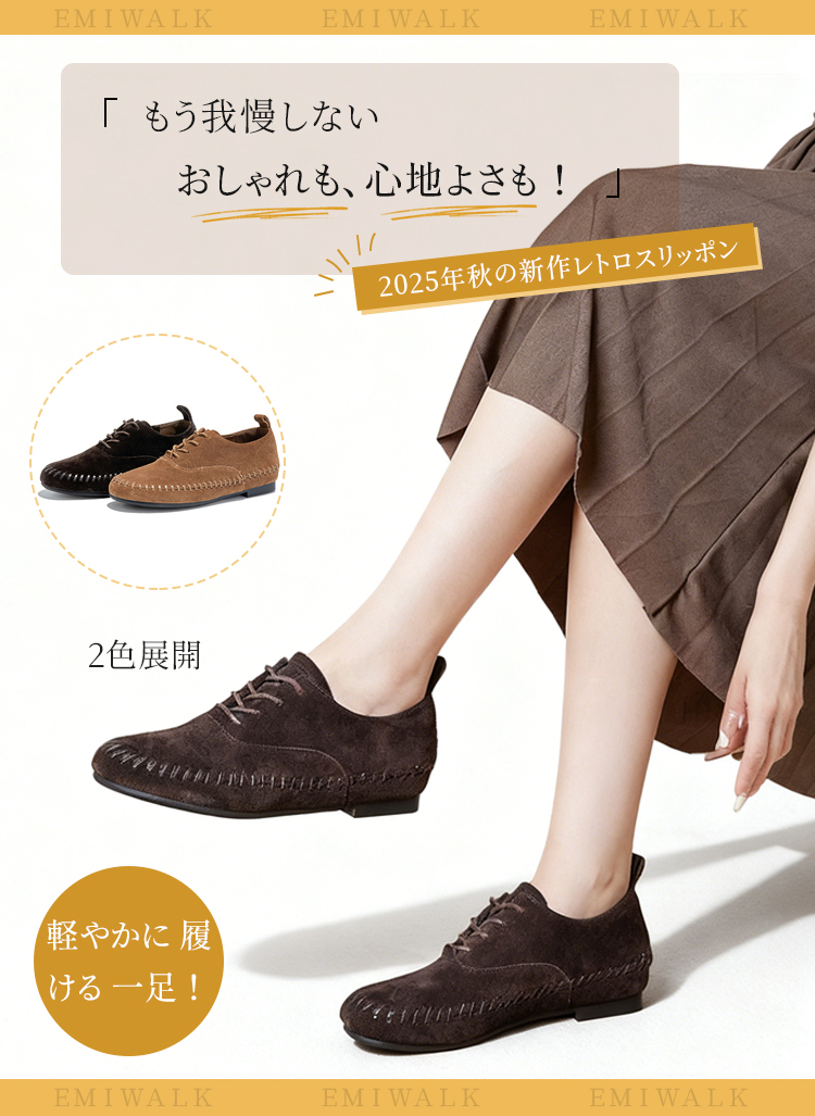 Emiwalk 本革フラットシューズ プレミアム牛革の柔らかさと洗練されたレトロデザイン 熟練の職人による精密な採寸と丁寧な裁断、手縫い仕上げのこだわりの製作工程 180度曲がる驚きの柔軟性でストレスフリーな歩行を実現する本革スリッポン 履きやすさを追求したソフトな履き口と美しいステッチが特徴のレザーシューズ きめ細やかで肌触りが良い厳選されたプレミアム牛革アッパーの質感詳細 濡れた路面でも滑りにくく耐久性に優れたアウトソール構造 足に馴染む柔らかな牛革を採用した超軽量で歩きやすいレディースフラットパンプス つま先を締め付けない「ゆったり幅広トゥ」設計と一般的な靴との比較イメージ 【匠人の手縫い仕上げ】ナチュラルなスエード仕上げのオックスフォード風シューズ - 1011274198 - emiwalk 【匠人の手縫い仕上げ】ナチュラルなスエード仕上げのオックスフォード風シューズ - 1011274198 - emiwalk