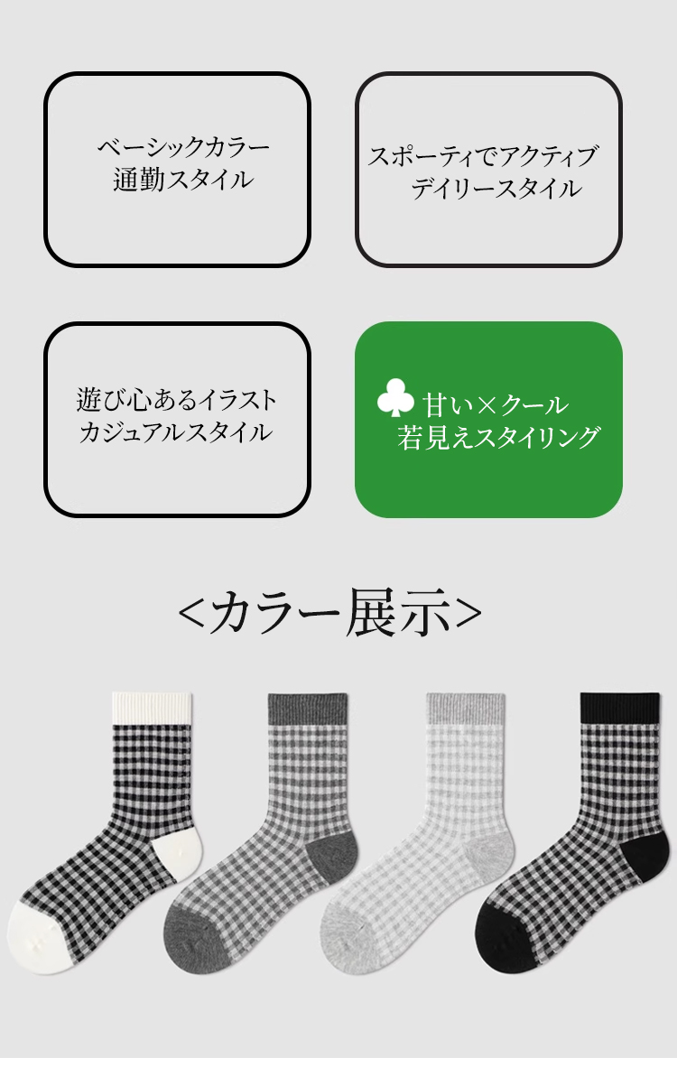 高品質コットン ギンガムチェック柄 クルーソックス 吸汗 通気 レディース 靴下 4足セット