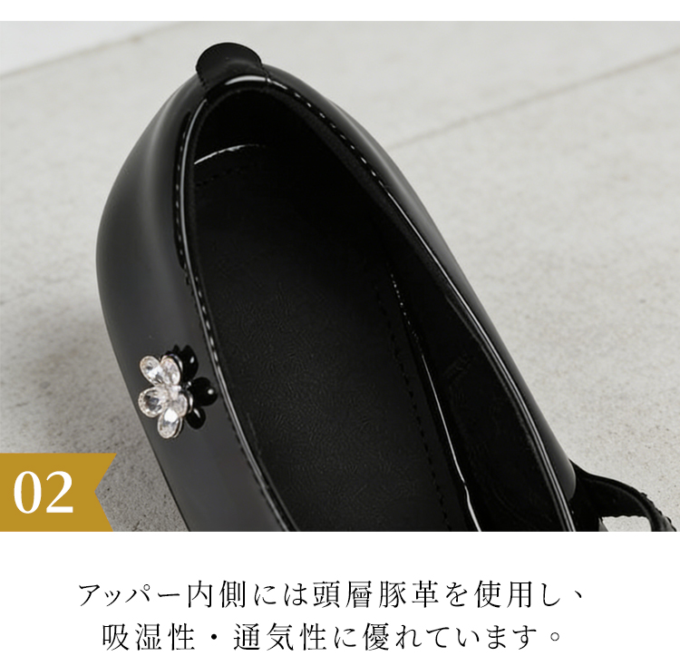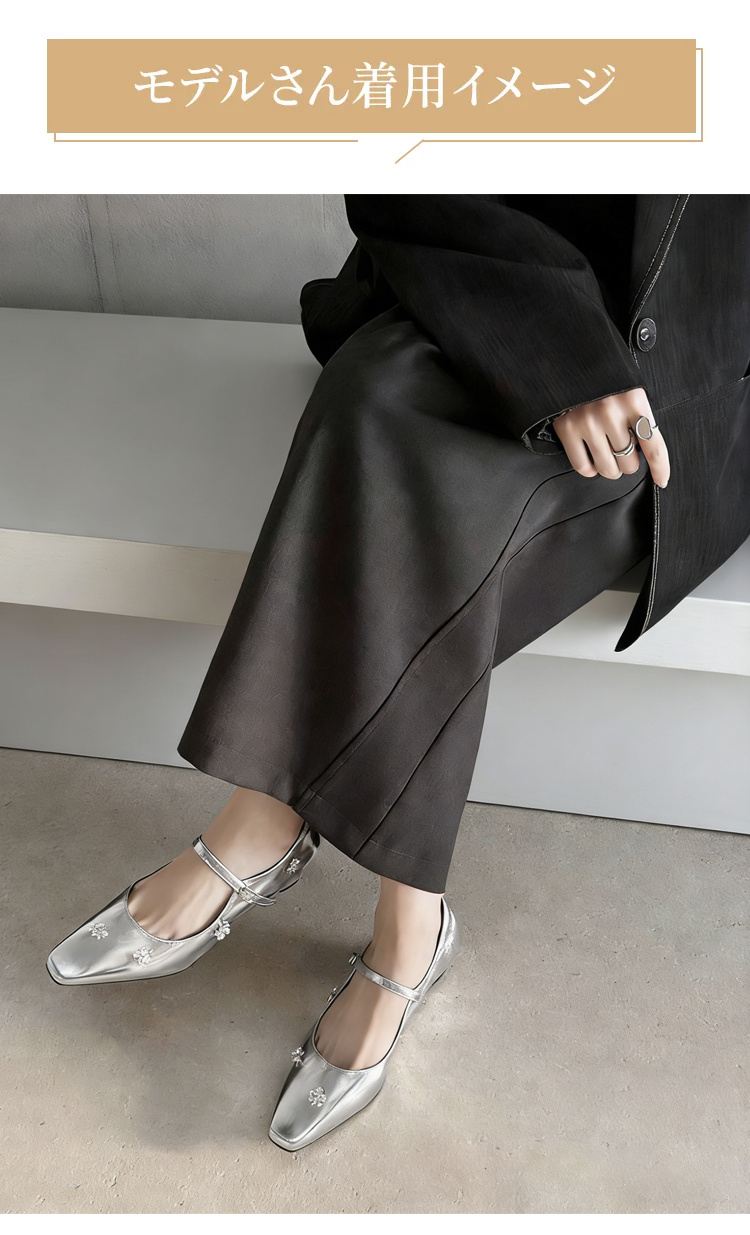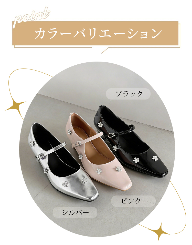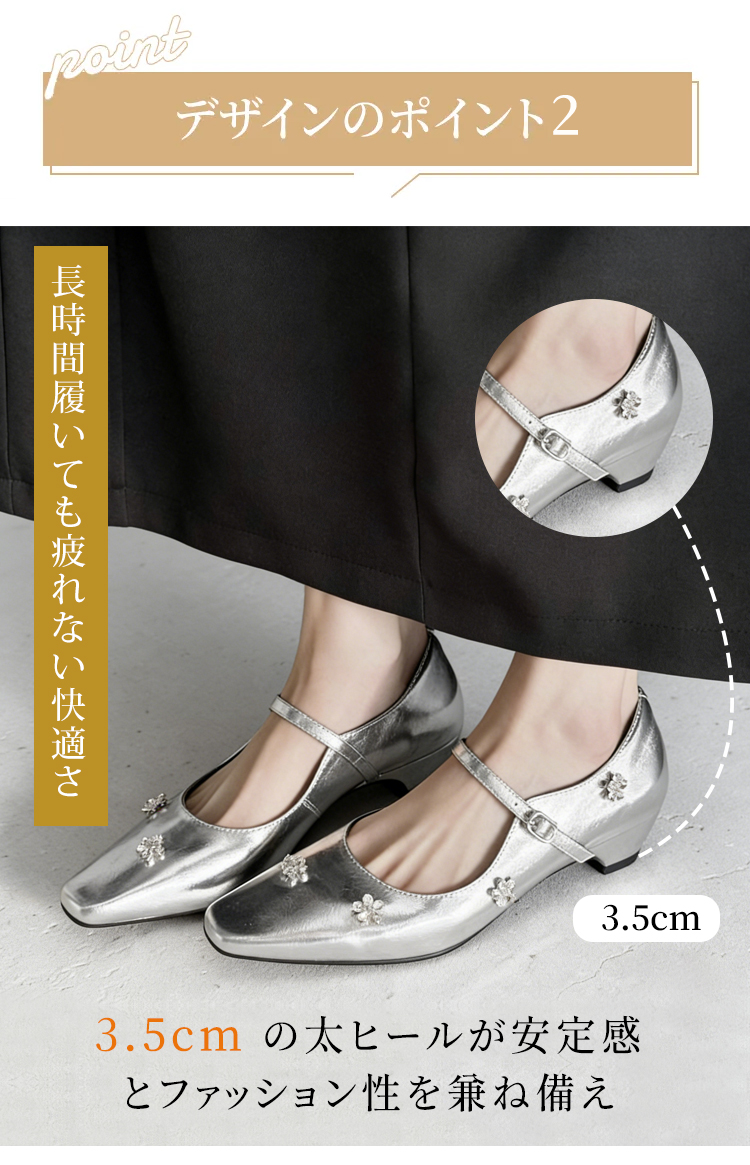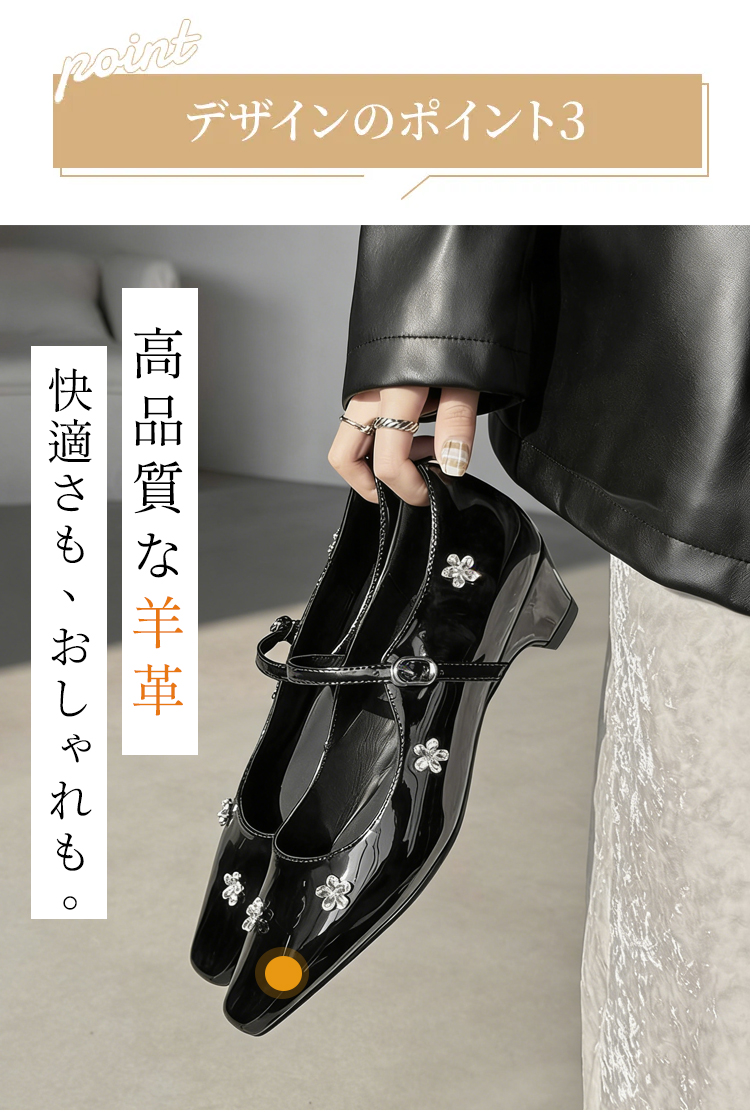 羊革 フラワーモチーフ ストラップパンプス スクエアトゥ 3.5cm太ヒール