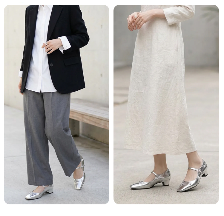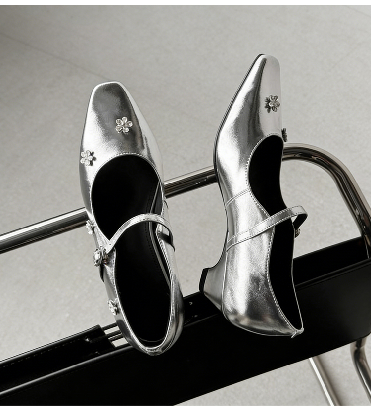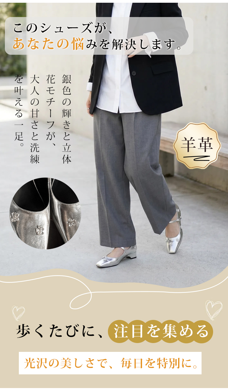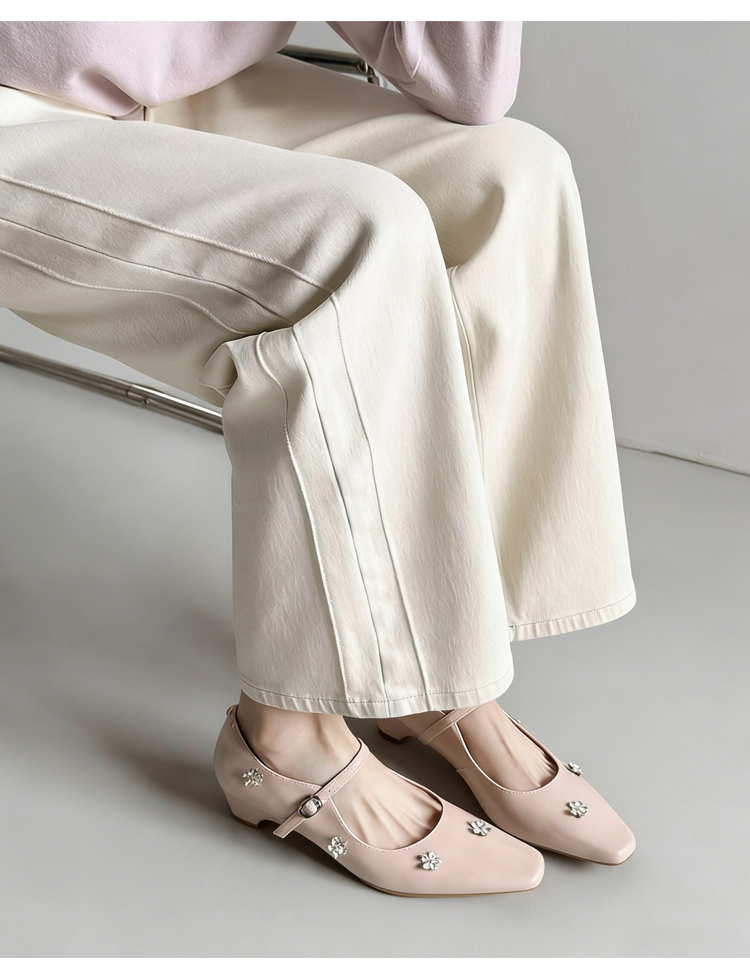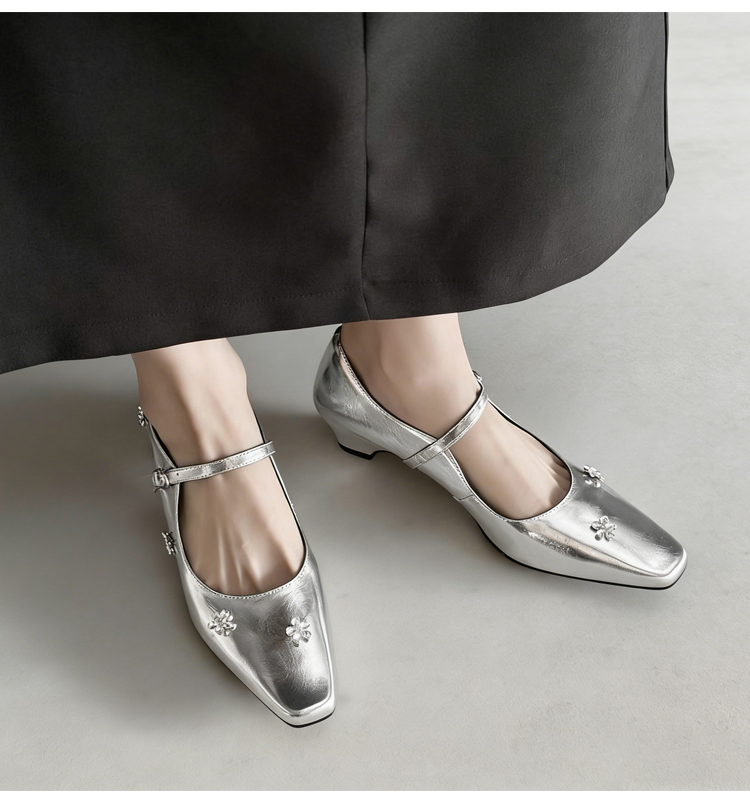 羊革 フラワーモチーフ ストラップパンプス スクエアトゥ 3.5cm太ヒール