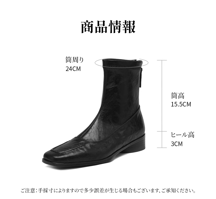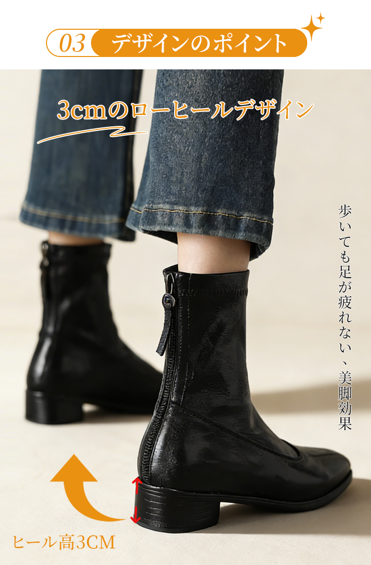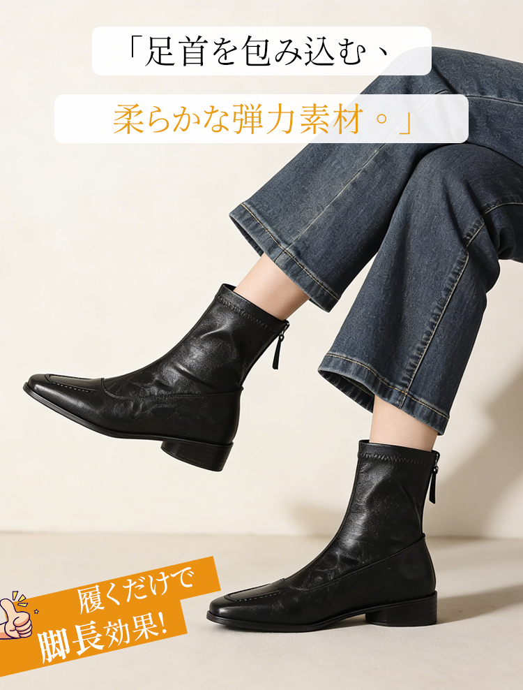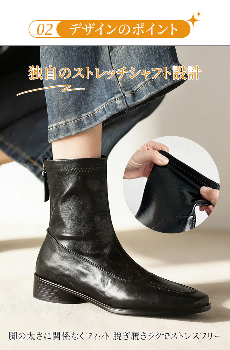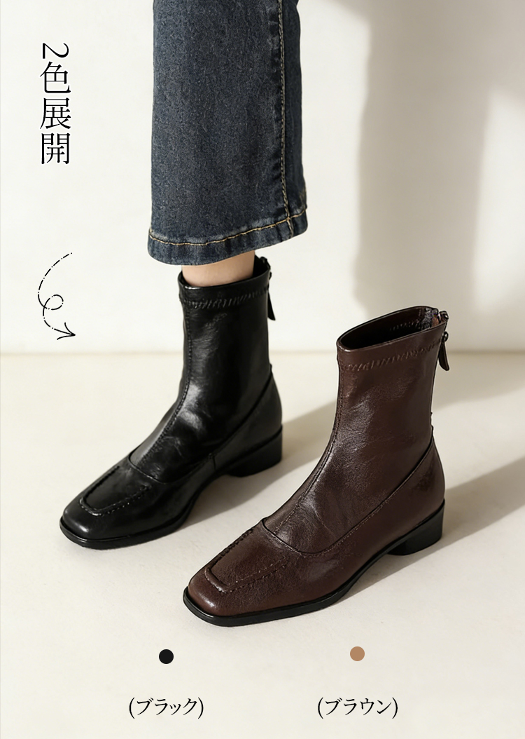 ストレッチ ショートブーツ スクエアトゥ バックジッパー 3cmローヒール 2種裏地選べる 軽量設計