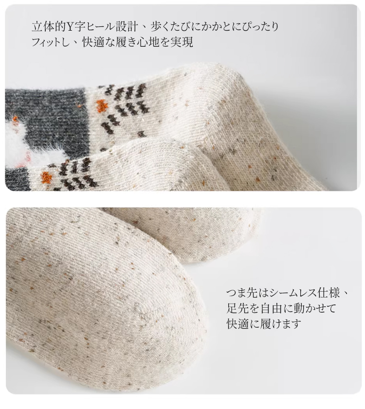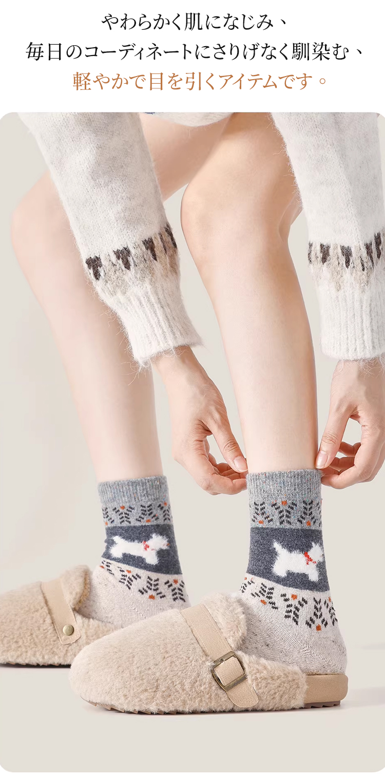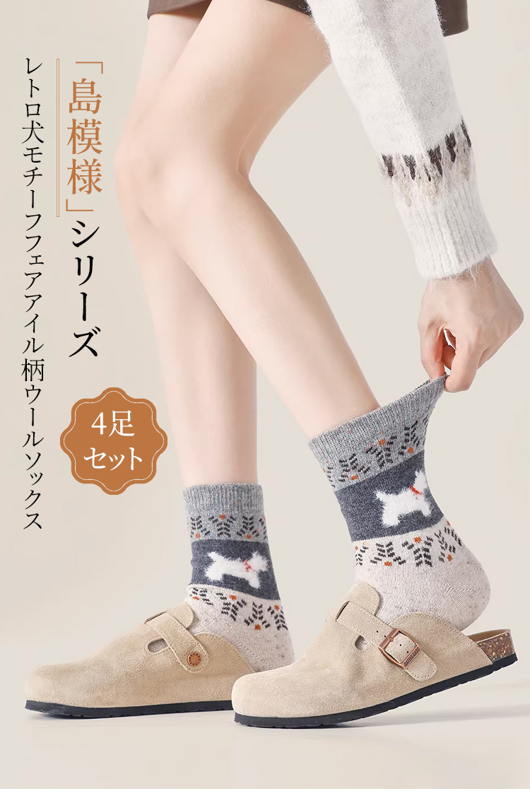 天然ウール混 ソックス 4足セット テリア柄 北欧風 保温 防寒 厚手靴下