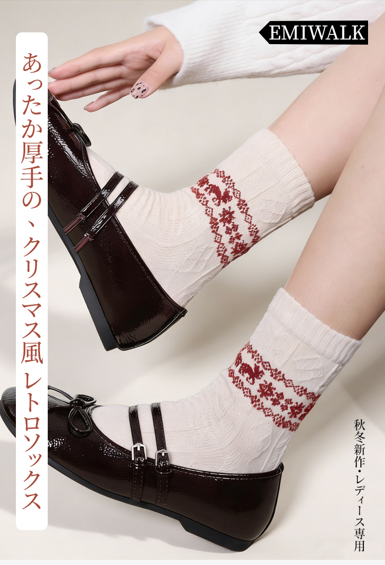 Emiwalk 北欧風ウールソックス ケーブル編み 赤色 暖かい冬のコーディネート ウール素材靴下 保温性と通気性を兼ね備えたジャガード編みの質感 繊細なジャガードデザイン ウールソックス 履き口のディテール 伸縮性の高いリブ編み 締め付けない快適なフィット感の靴下 クラシカルなケーブル編みソックス 丈夫で毛玉になりにくい高品質素材 【クリスマス風】レトロ フェアアイル柄 ソックス-emiwalk