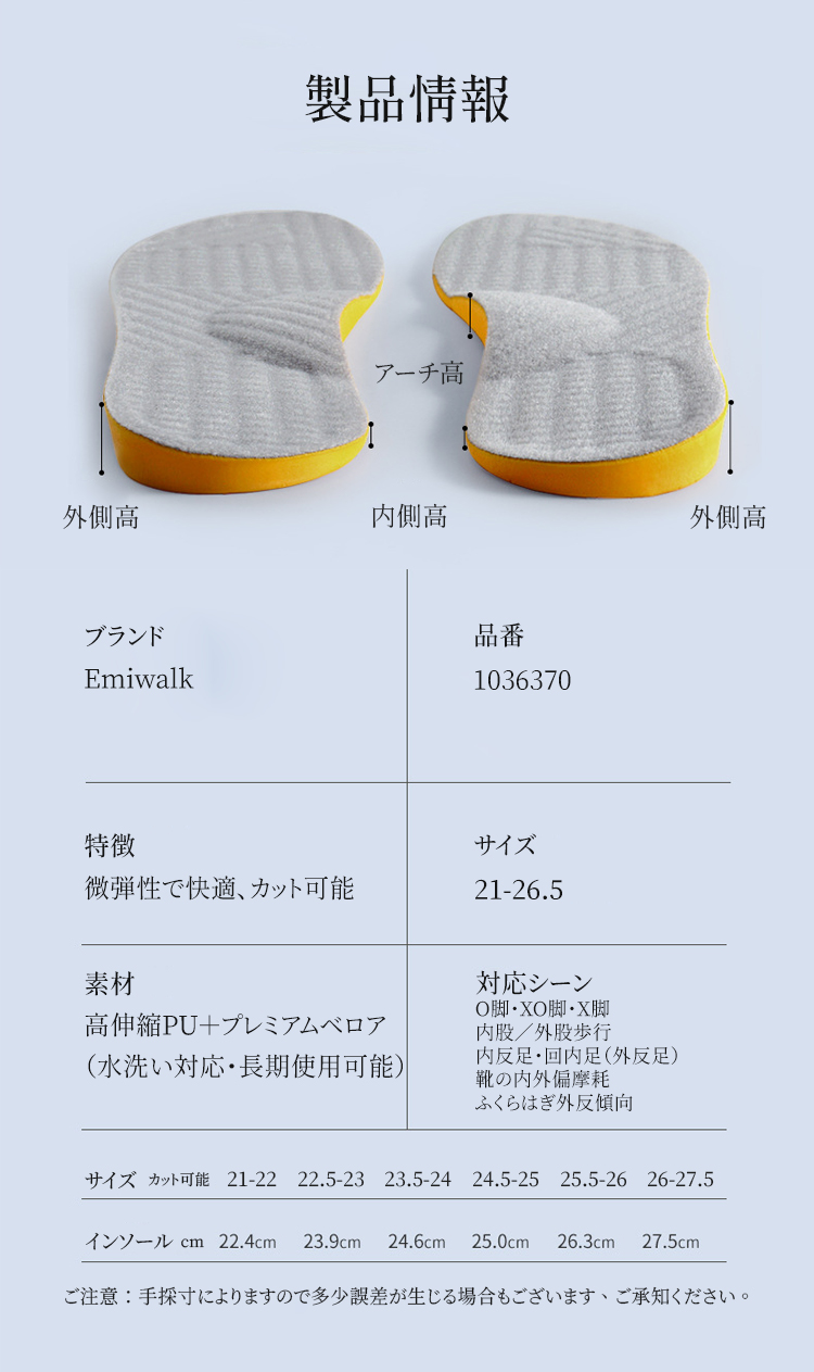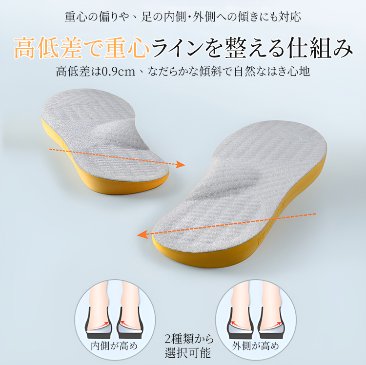 O脚 X脚 矯正 インソール 重心補正 衝撃吸収 抗菌防臭 男女兼用 - Emiwalk O脚・X脚のラインを整える重心バランス補正インソール 商品の全体構造と補正機能 O脚に合わせた内外高低差設計による重心移動の仕組み物理的な脚のライン矯正イメージ 高低差0.9cmのなだらかな傾斜による重心ライン調整機能 足の傾きをサポートする中敷き 力学的に3点に圧力を分散するアーチサポート設計 足裏の疲労軽減と崩れ防止の仕組み 弾力性のあるTPE素材を曲げる様子 歩行時の衝撃吸収と膝・腰への当たりを和らげる機能 足裏への当たりをやわらげ、衝撃を吸収やわらかく弾力のある素材