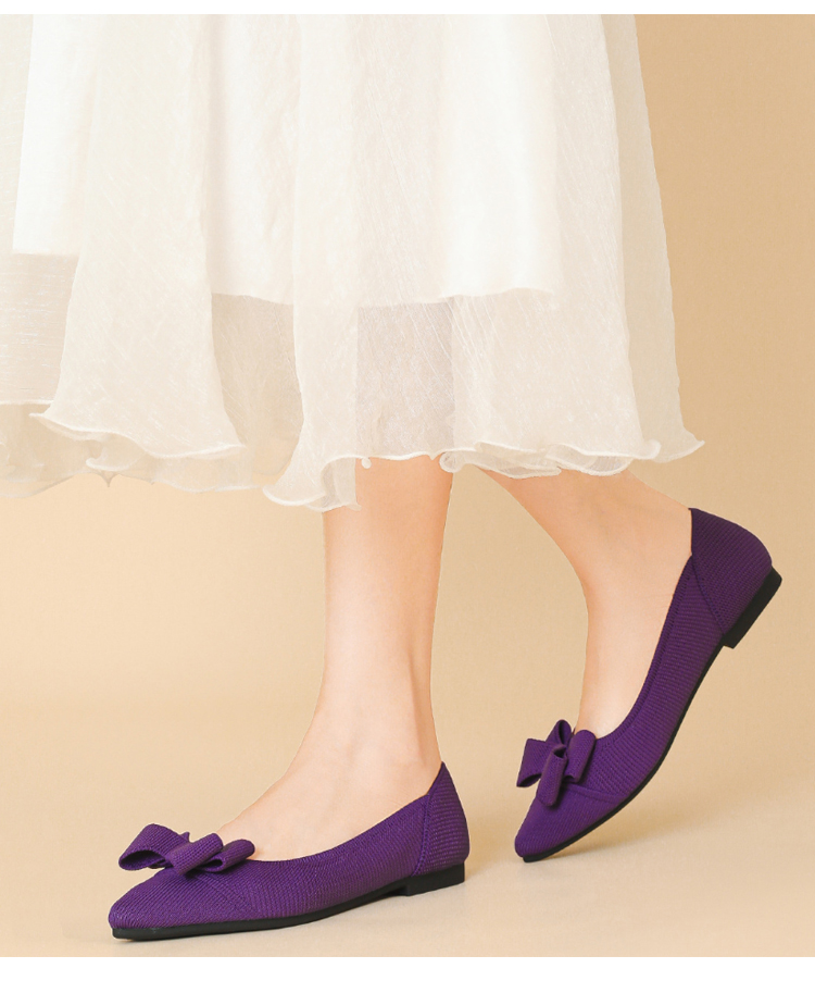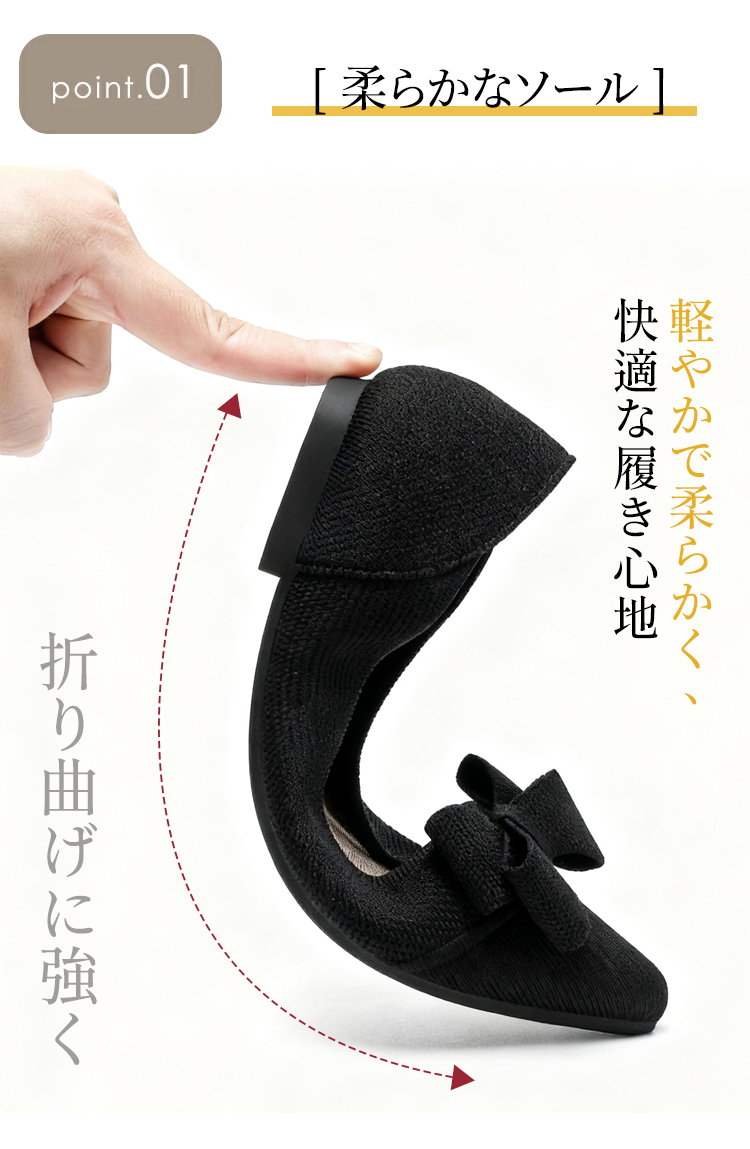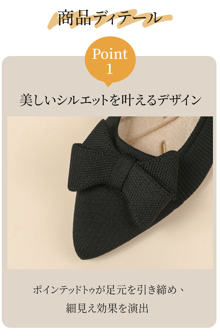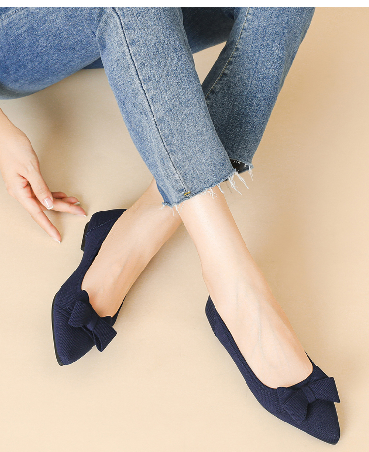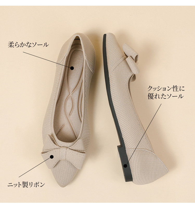 ポインテッドトゥ リボン ニットパンプス 軽ふわ 痛くない ローヒール レディース