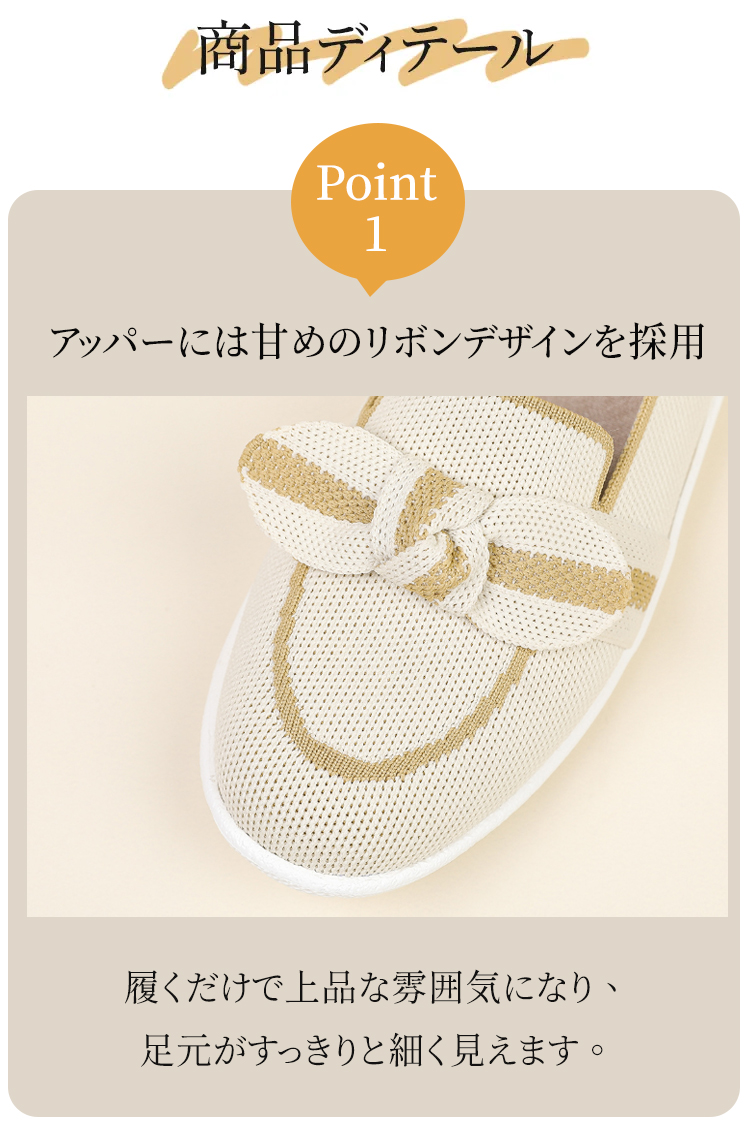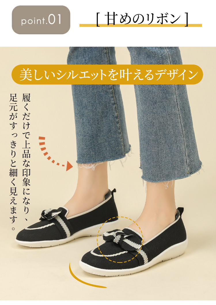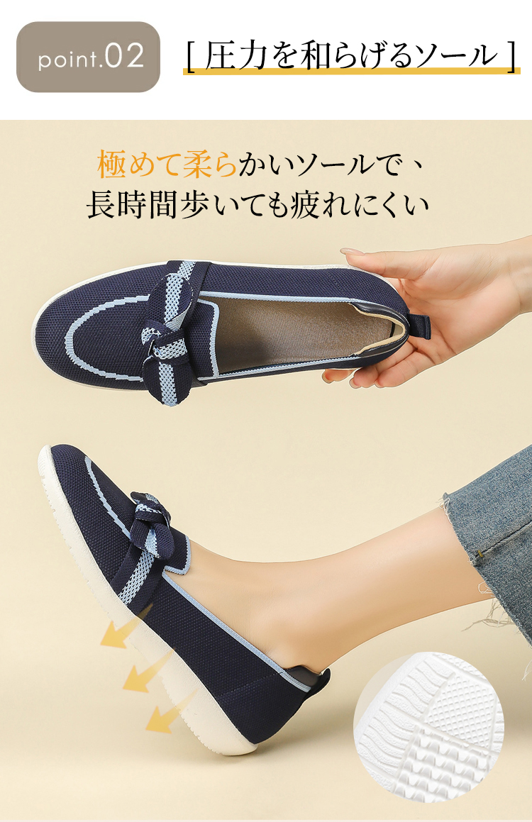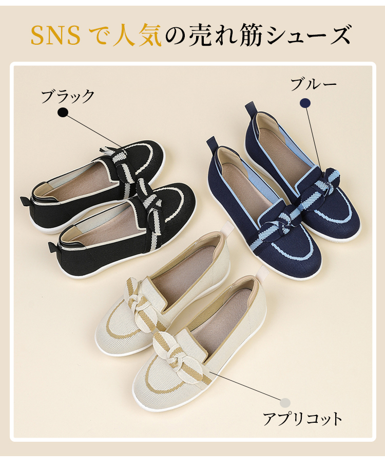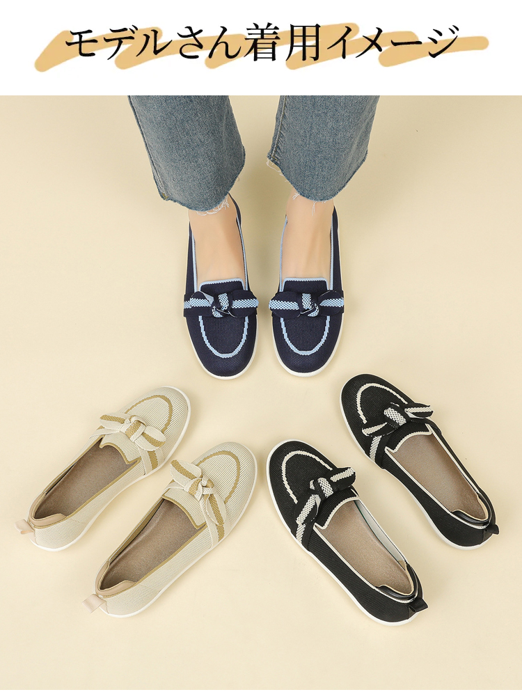 リボンモチーフ ニットローファー 軽量 通気性 ストレッチ 屈曲ソール レディース