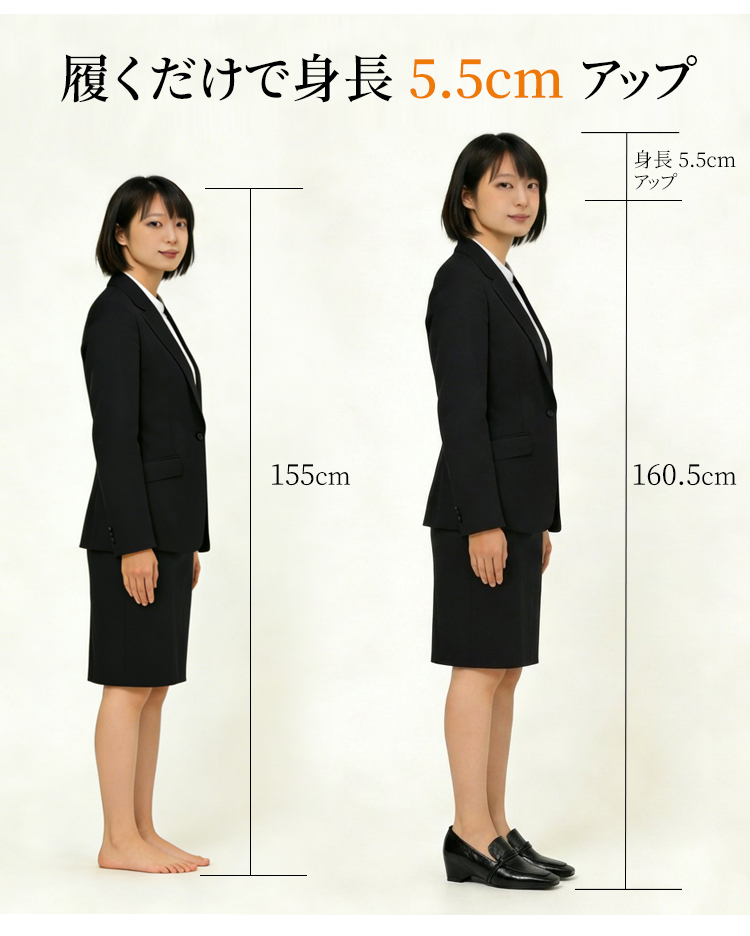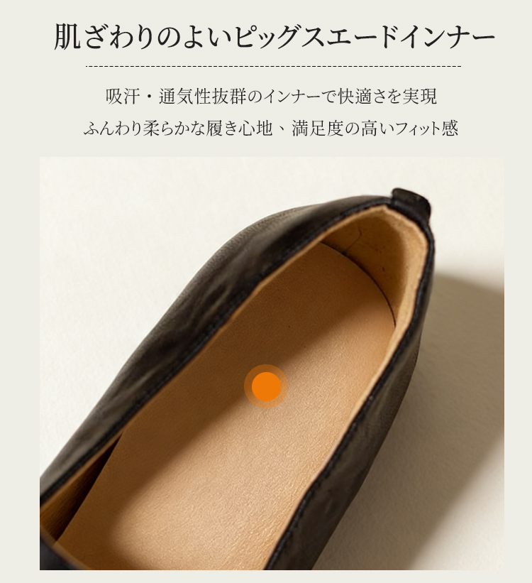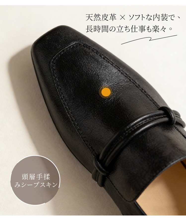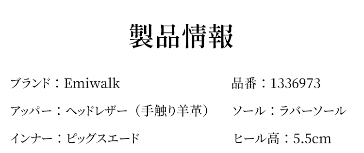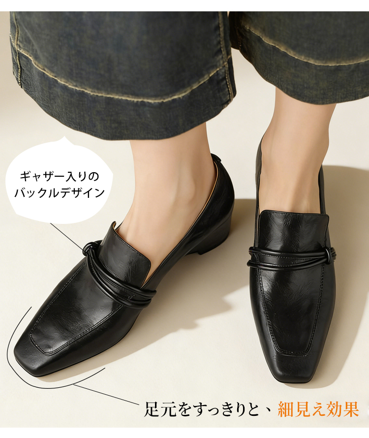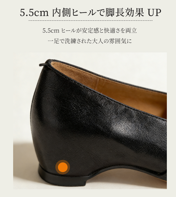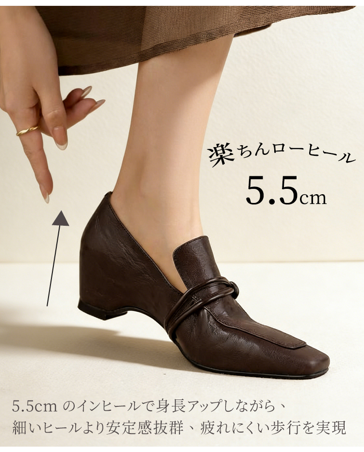 Emiwalk 新作 シープスキン 5.5cmスタイルアップパンプス ブラックとブラウンの2色展開 ギャザー入りバックルデザインとスクエアトゥによる足元の細見え効果 安定感抜群で疲れにくい5.5cmの楽ちんローヒール 側面のフォルム 履くだけで身長5.5cmアップ 155cmから160.5cmへのスタイルアップ比較 長時間の立ち仕事も楽々な天然皮革とソフトな内装のシープスキンパンプス 繊細な風合いと柔らかな肌触りが特徴の頭層手揉みシープスキン(羊革) 甲高・幅広・外反母趾の方へのワンサイズアップ推奨案内と上脚イメージ トレンドカラーのブラウンとブラック 2色並んだ上からのディテール 【羊革】インヒール5.5cmのローファー|見えないヒールで脚が長く見える 【羊革】インヒール5.5cmのローファー|見えないヒールで脚が長く見える