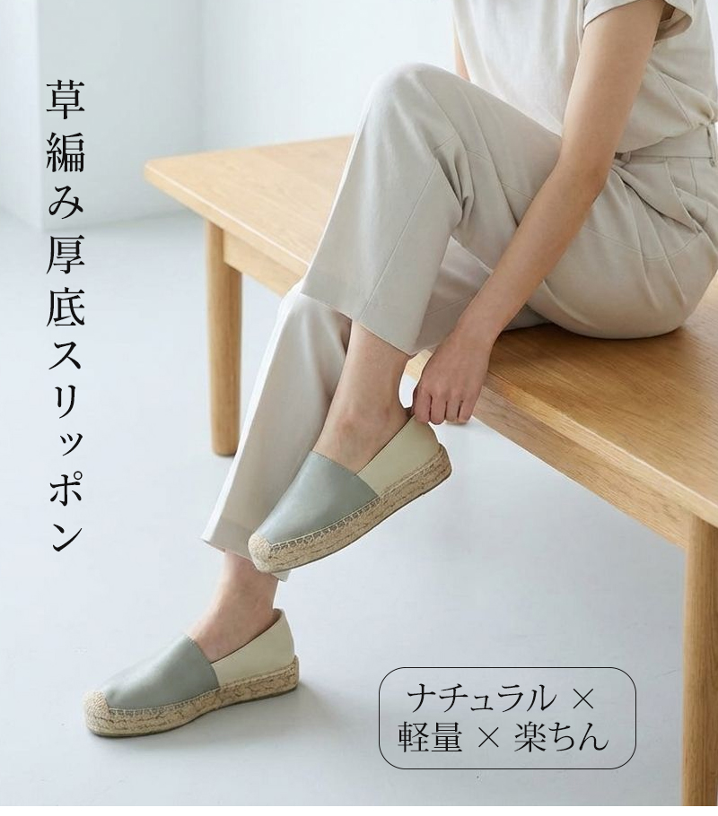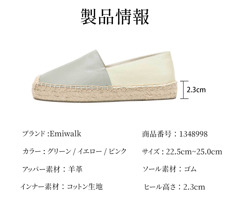 厚底のスリッポンタイプ・麦わらサンダル エミウォーク 羊革バイカラーエスパドリーユ グリーン 日系万能コーデ 週末のお出かけスタイルに最適なイエローの本革ジュートスリッポン 上質な羊革素材と天然草編みのナチュラルな風合い・ステッチ詳細 上質な羊革素材と天然草編みのナチュラルな風合い・ステッチ詳細 通気性抜群のコットン生地インソール ムレにくい快適な履き心地 本革アッパーとジュート中底、ゴム製ソールを組み合わせた構造説明 超軽量設計で足への負担を軽減するストレスフリーな履き心地 疲れにくいヒール高さ約2.3cmの軽量ゴム製ソール 厚底のスリッポンタイプ・麦わらサンダル 厚底のスリッポンタイプ・麦わらサンダル 厚底のスリッポンタイプ・麦わらサンダル Emiwalk エスパドリーユ製品情報 羊革・コットン生地・22.5cmから25.0cm対応 羊革 バイカラー ジュート エスパドリーユ スリッポン フラットシューズ 厚底のスリッポンタイプ・麦わらサンダル 厚底のスリッポンタイプ・麦わらサンダル