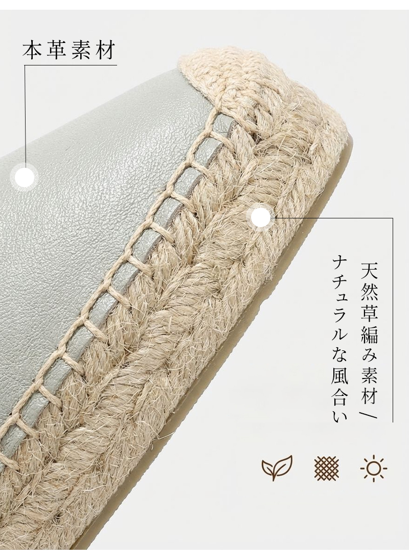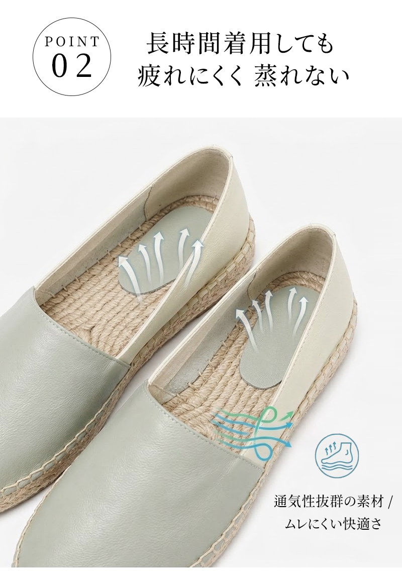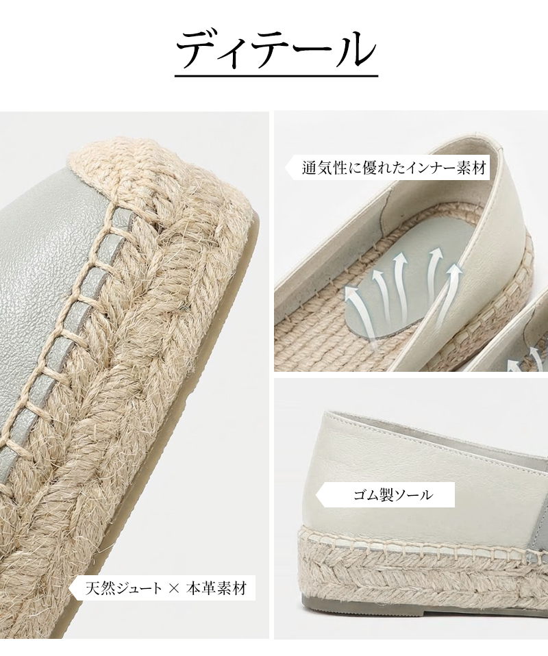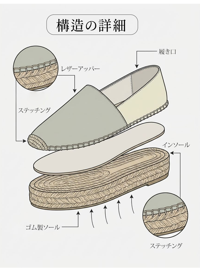 天然ジュートで編まれたソールと、柔らかな羊革のアッパーが、ナチュラルな風合いと上質な肌触りを実現。通気性に優れたインナー素材が、蒸れにくい快適な履き心地を提供します。