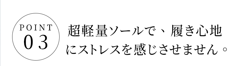 約2.3cmのフラットヒールが、長時間の歩行でも疲れにくい安定感を提供。ゴム製ソールが衝撃を吸収し、歩行時の快適さを高めます。
