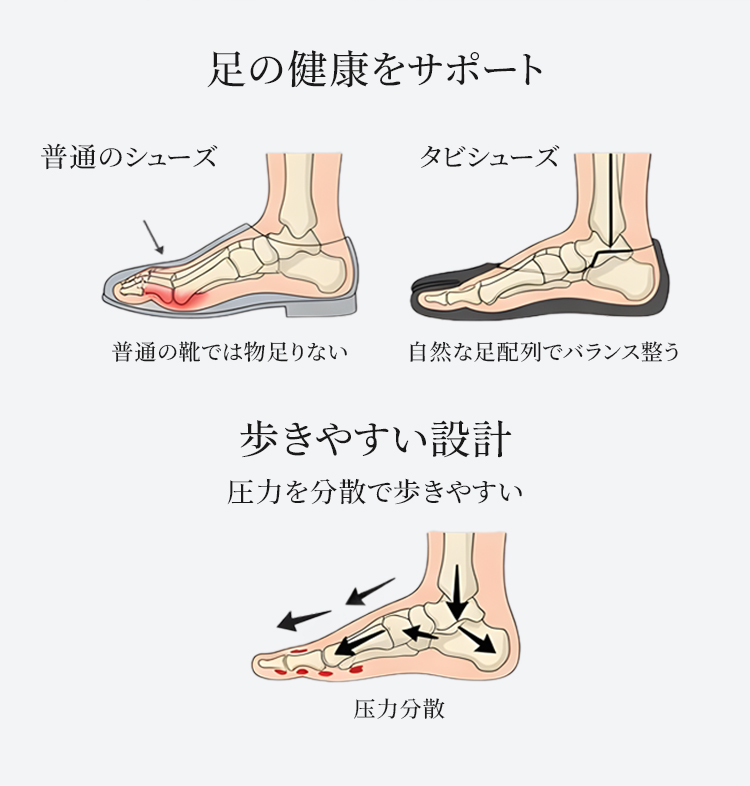 足指の圧力を効果的に分散し、快適性を高めるユニークでスタイリッシュなセパレートトゥ(猪蹄シューズ風)デザイン。