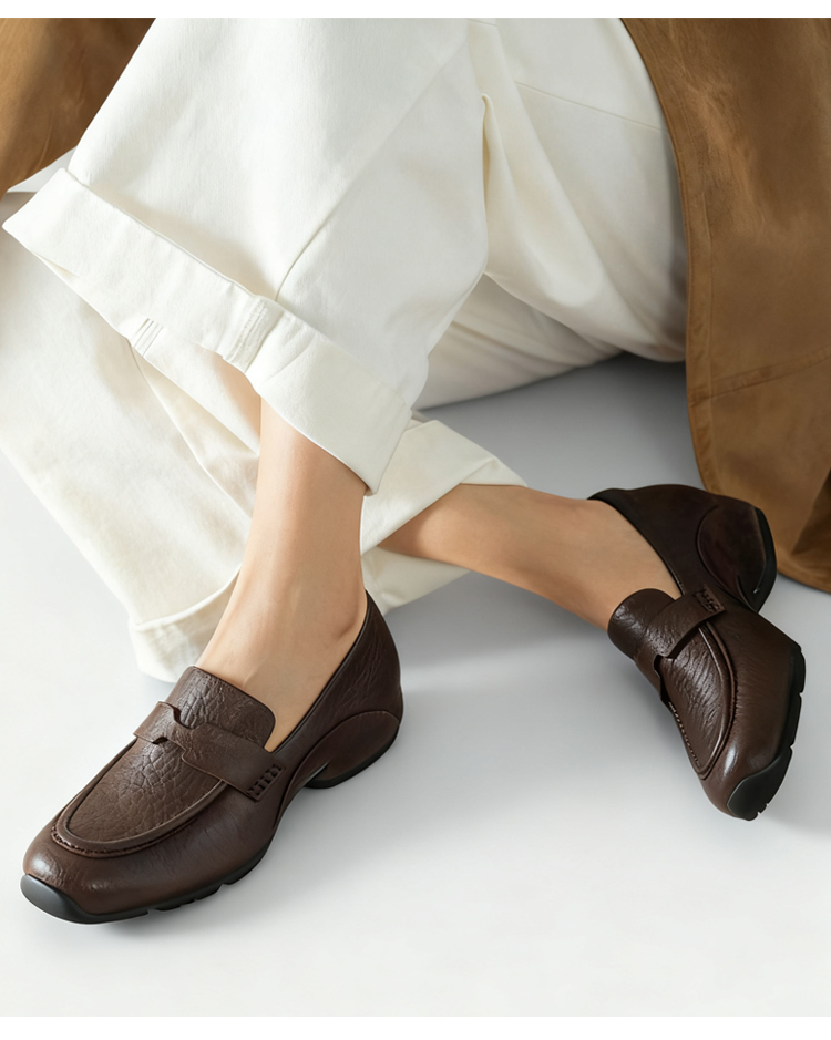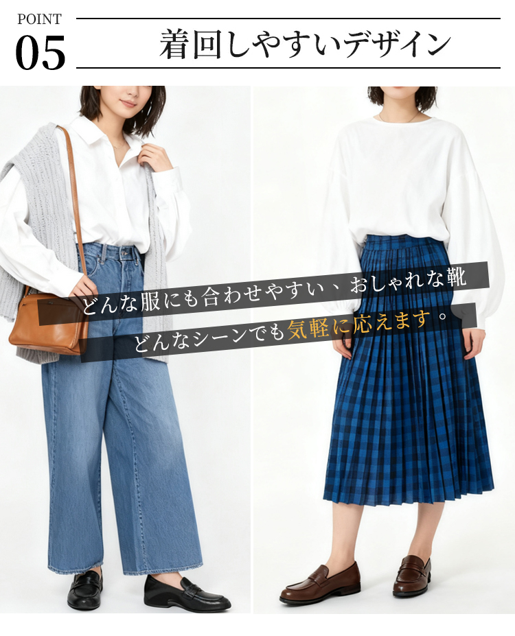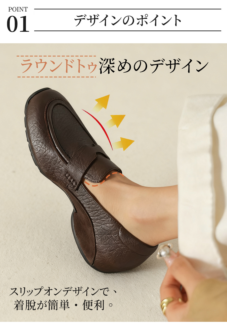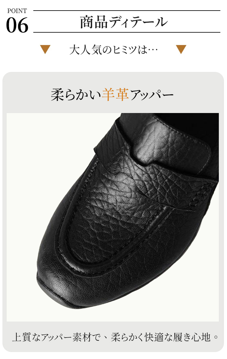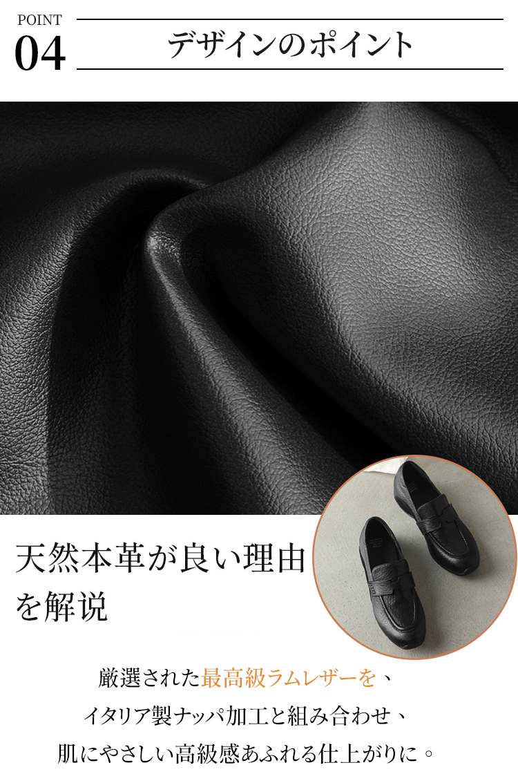Emiwalk 4cmヒールアップ本革ローファー ブラックとブラウンの2色展開 ラウンドトゥと深めのアッパーデザイン 足をしっかり包み込むスリッポン構造 衝撃吸収機能を備えた厚底の柔らかいソール 歩きやすさを追求した設計 ヒール高4cmで脚をすっきりと長く見せる美脚シルエットの着用イメージ 極めて柔らかいインソールの接写 クッション性抜群で疲れにくい内側 防滑性と耐摩耗性に優れた凹凸のあるラバーソールの裏面デザイン 甲高・幅広・外反母趾の方におすすめのゆったりしたサイズ感の着用例 SNSで人気の売れ筋シューズ デニムやスカートに合わせた大人の休日コーデ 2万歩OK!羊革スリッポンローファー|スポーツソールで快適歩行 - 1011230752 - emiwalk 2万歩OK!羊革スリッポンローファー|スポーツソールで快適歩行 - 1011230752 - emiwalk